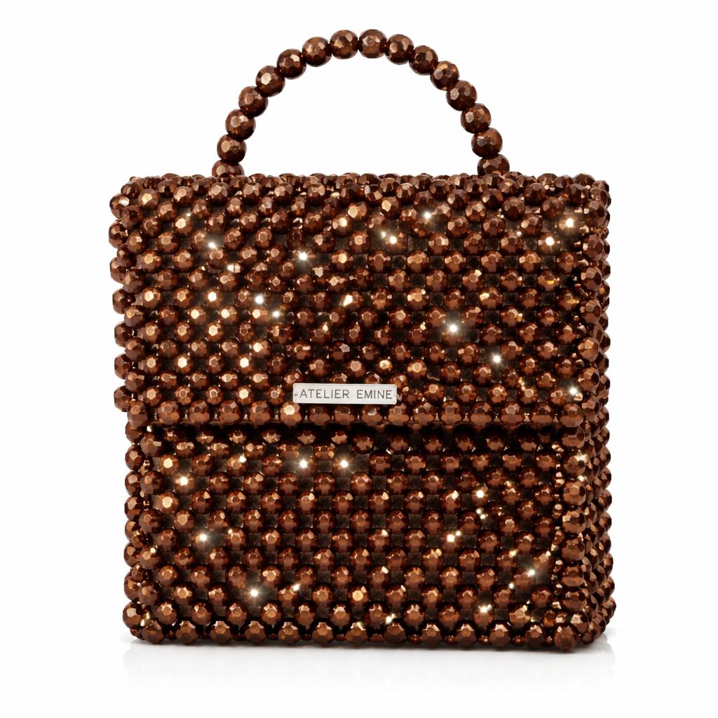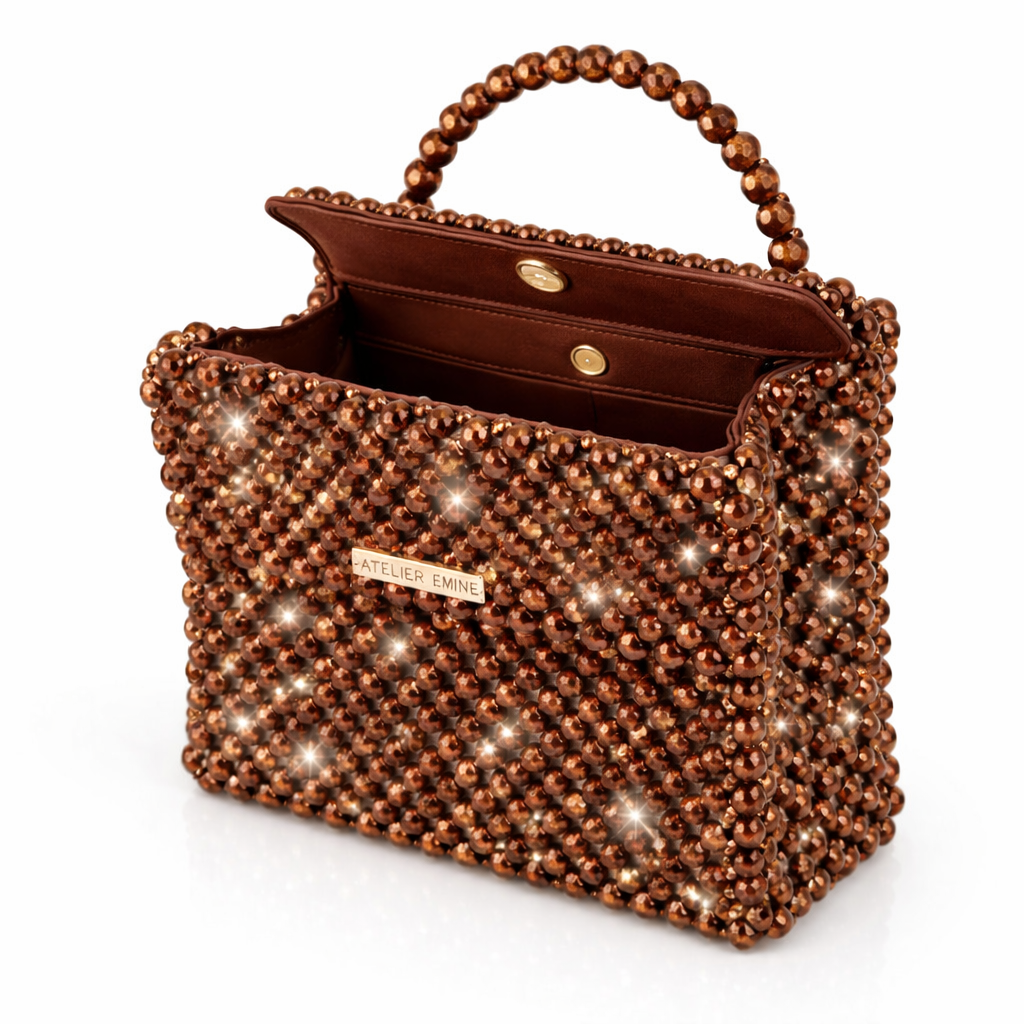Çanta gövdesi, 8 mm standart yuvarlak kesim optik sınıfı kristal boncukların, yüksek dayanımlı monofilament misina kullanılarak yüksek yoğunluklu düz örgü tekniğiyle tek tek işlenmesi sonucu tamamen el işçiliğiyle oluşturulmuştur. Kristallerin sık ve homojen dizilimi, yüzey boyunca kesintisiz bir parlaklık sağlarken; örgü yapısı çantanın desteksiz şekilde formunu koruyabilen rijit bir yapı kazanmasını mümkün kılar.