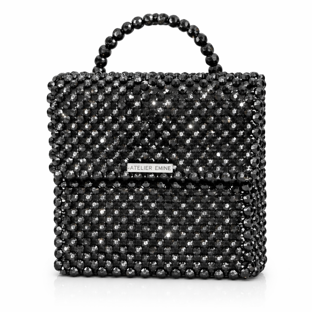 Çanta gövdesi, 8 mm standart yuvarlak kesim optik sınıfı kristal boncukların, yüksek dayanımlı monofilament misina kullanılarak yüksek yoğunluklu düz örgü tekniğiyle tek tek işlenmesi sonucu tamamen el işçiliğiyle oluşturulmuştur. Kristallerin sık ve homojen dizilimi, yüzey boyunca kesintisiz bir parlaklık sağlarken; örgü yapısı çantanın desteksiz şekilde formunu koruyabilen rijit bir yapı kazanmasını mümkün kılar.