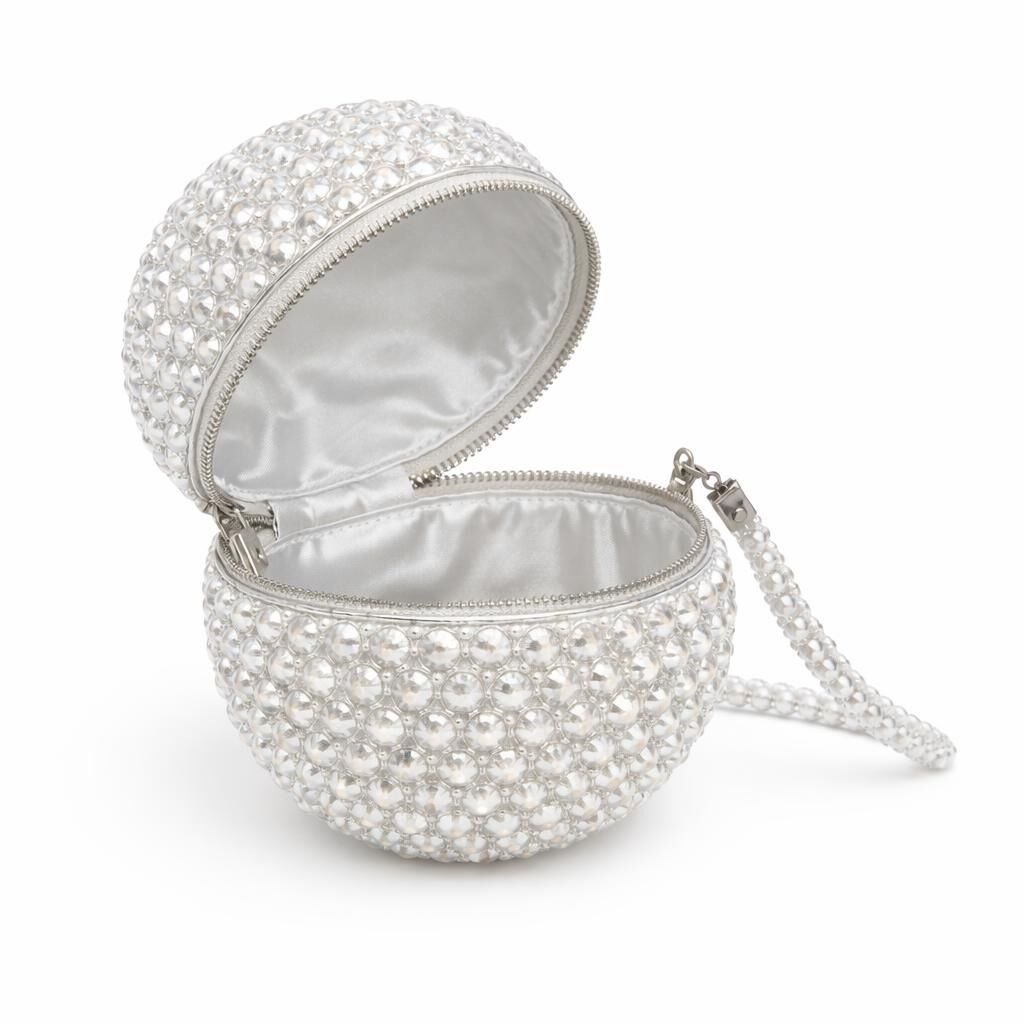 Modelin üst bölümünde yer alan metal fermuarlı kapatma sistemi, küresel yapıya entegre edilerek tasarlanmış; fermuar hattı, form bütünlüğünü bozmadan çantanın çevresini takip edecek şekilde konumlandırılmıştır. Fermuar çekme ucu ve metal aksesuarlar, kristal dokuyla kontrast oluşturmadan, dengeli bir parlaklık sunar.