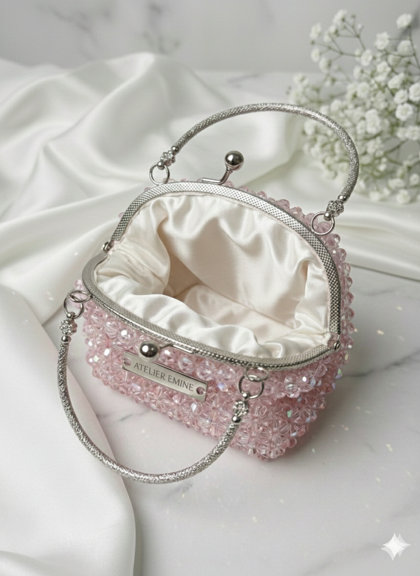 Atelier Emine’in Crystal Gelato Couture serisine ait  Cotton Candy Creme , 8 mm optik sınıfı kristal boncuklar, 316L paslanmaz çelik kulp ve saten astar kullanılarak tamamen el işçiliğiyle üretilmiş premium clutch modelidir.