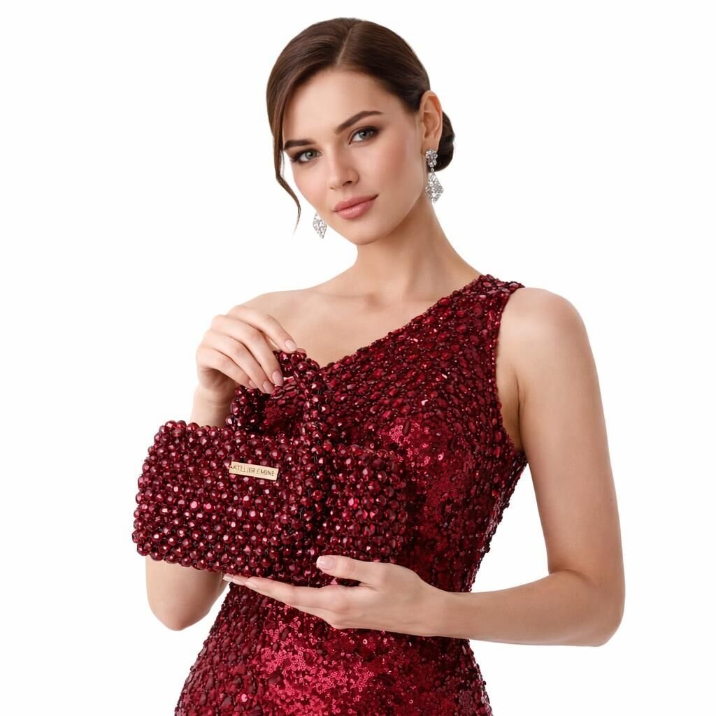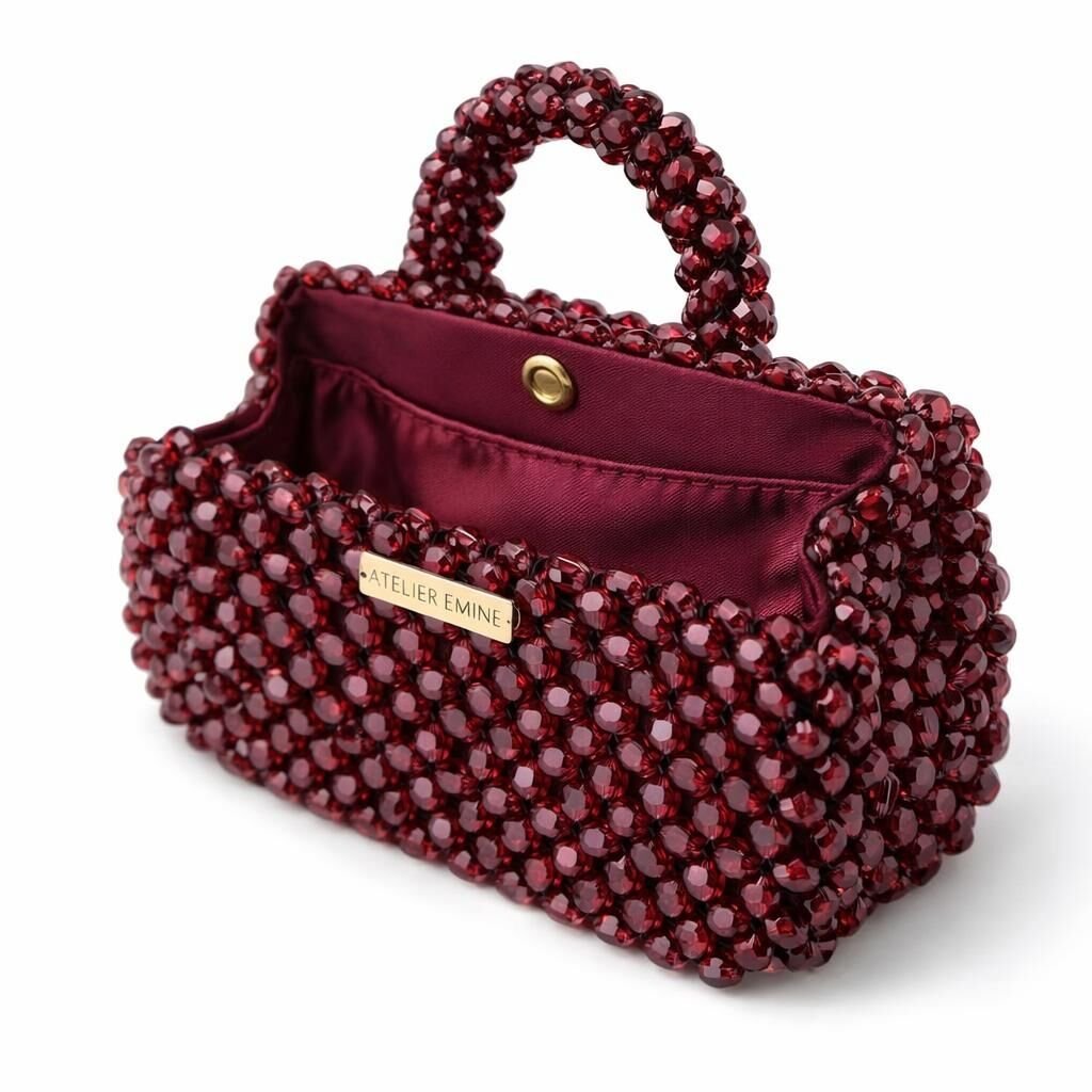 Atelier Emine’in Crystal Gelato Couture koleksiyonuna ait Fresco Barolo, 8 mm standart yuvarlak kesim optik sınıfı kristal boncukların yüksek mukavemetli misina ile örülmesiyle tamamen el işçiliğiyle üretilmiş, yapısal formu ve mücevher etkili yüzeyiyle öne çıkan bir top-handle mini çanta modelidir.