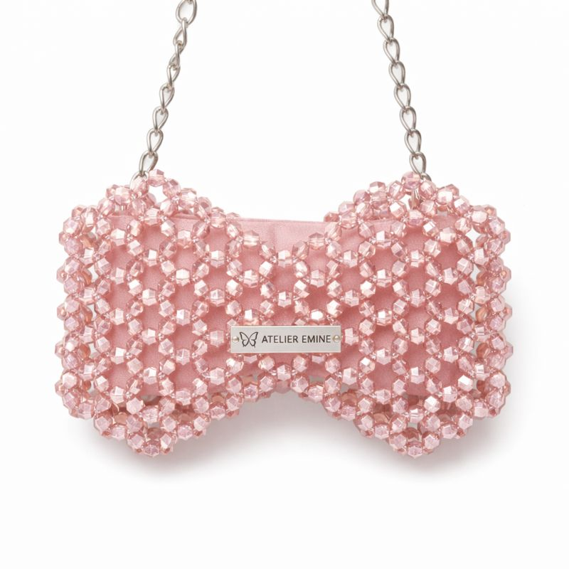 Atelier Emine’in Crystal Gelato Couture serisine ait Fresco Flamé, 8 mm optik sınıfı kristal boncukların yüksek dayanımlı misina ile örülmesiyle tamamen el işçiliğiyle üretilmiş, fiyonk formunda heykelsi bir mini çanta modelidir.