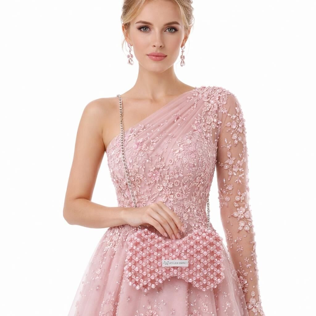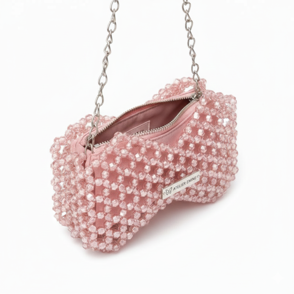 Kristal boncuklar, yüzeyde güçlü bir doku derinliği ve net ışık kırılımı oluşturacak şekilde yoğun ve modüler bir örgü sistemiyle tek tek işlenmiştir. Gövde, iki simetrik hacmin merkezde birleştiği fiyonk siluetiyle yapılandırılarak güçlü bir görsel kimlik elde edilmiştir.
