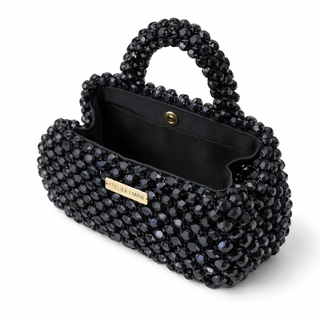 Atelier Emine’in Crystal Gelato Couture koleksiyonuna ait Fresco Tenebra, 8 mm standart yuvarlak kesim optik sınıfı kristal boncukların yüksek mukavemetli misina ile örülmesiyle tamamen el işçiliğiyle üretilmiş, yapısal formu ve mücevher etkili yüzeyiyle öne çıkan bir top-handle mini çanta modelidir.