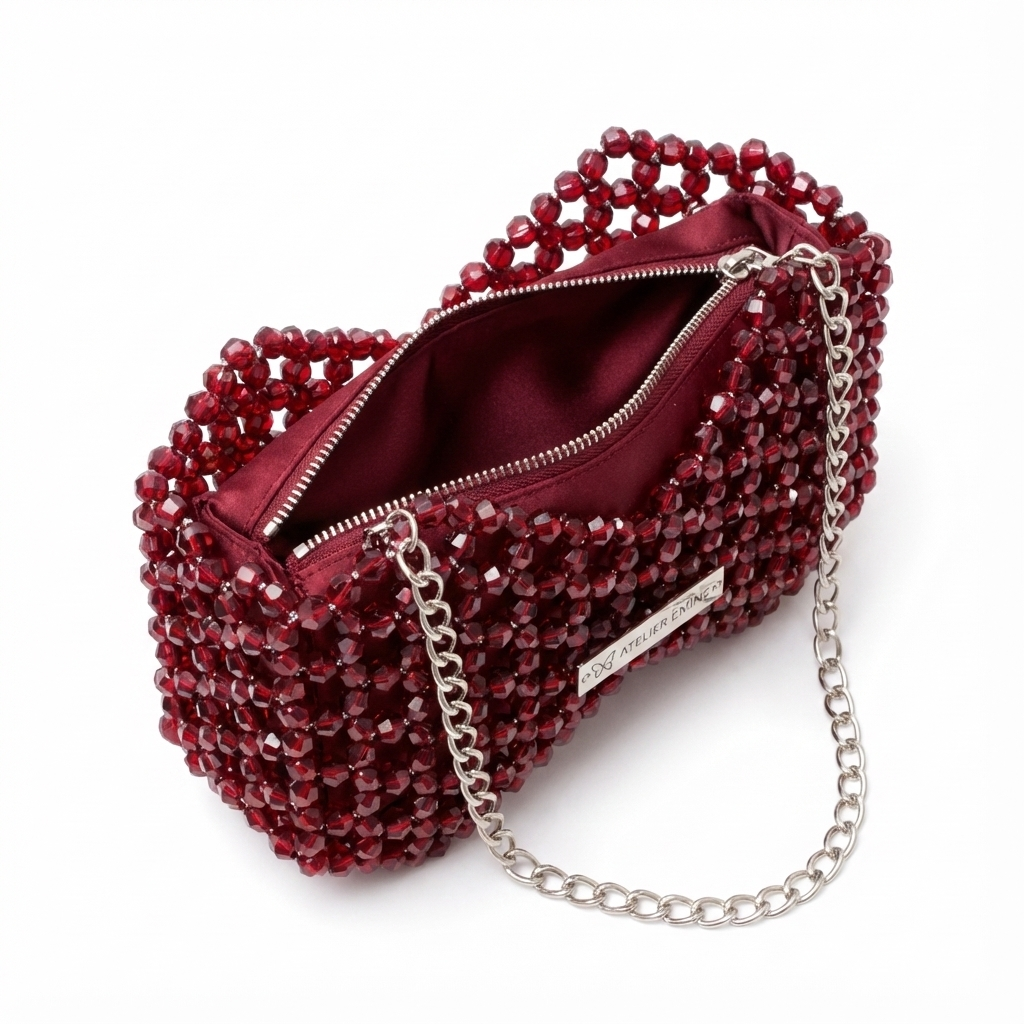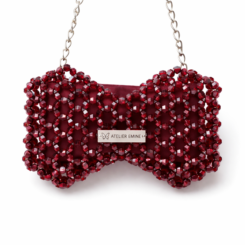 Atelier Emine’in Crystal Gelato Couture serisine ait Fresco Wine, 8 mm optik sınıfı kristal boncukların yüksek dayanımlı misina ile örülmesiyle tamamen el işçiliğiyle üretilmiş, fiyonk formunda heykelsi bir mini çanta modelidir.