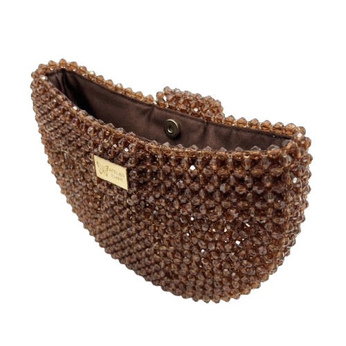 Atelier Emine’in Crystal Gelato Couture serisine ait Melo Chestnut, 8 mm optik sınıfı kristal boncukların yüksek dayanımlı misina ile örülmesiyle tamamen el işçiliğiyle üretilmiş, yarım ay formunda premium mini çanta modelidir.