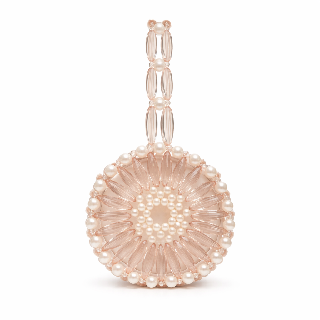 Atelier Emine’in Crystal Gelato Couture koleksiyonuna ait Melo Nude, merkezden çevreye doğru katmanlanan dairesel örgü kompozisyonu ve dikey eksende yükselen kulp mimarisiyle tasarlanmış, heykelsi karaktere sahip premium el yapımı kristal mini çanta modelidir.