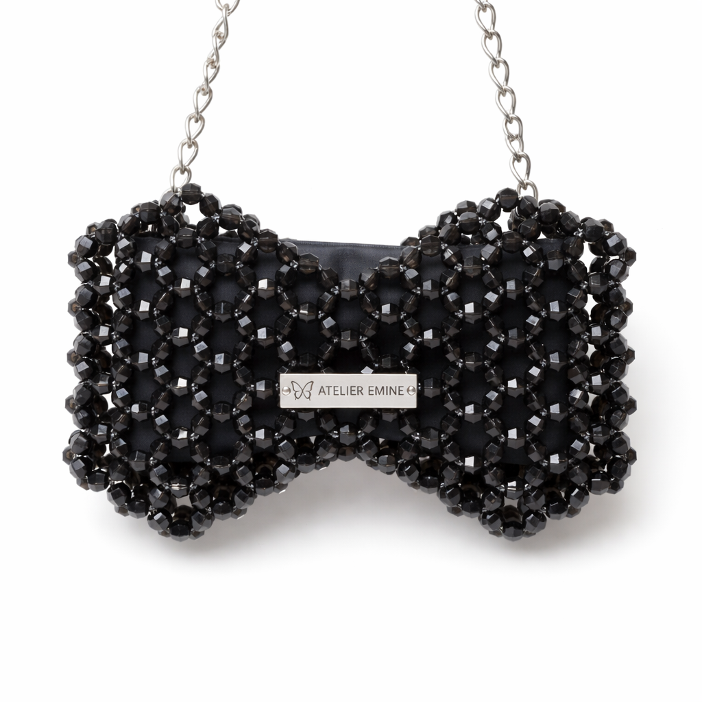 Atelier Emine’in Crystal Gelato Couture serisine ait Fresco Midnight, 8 mm optik sınıfı kristal boncukların yüksek dayanımlı misina ile örülmesiyle tamamen el işçiliğiyle üretilmiş, fiyonk formunda heykelsi bir mini çanta modelidir.