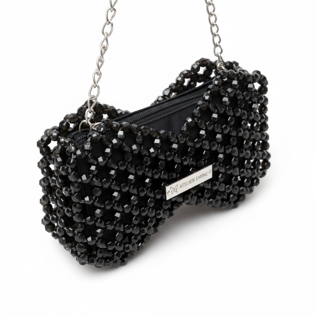 Kristal boncuklar, yüzeyde güçlü bir doku derinliği ve net ışık kırılımı oluşturacak şekilde yoğun ve modüler bir örgü sistemiyle tek tek işlenmiştir. Gövde, iki simetrik hacmin merkezde birleştiği fiyonk siluetiyle yapılandırılarak güçlü bir görsel kimlik elde edilmiştir.