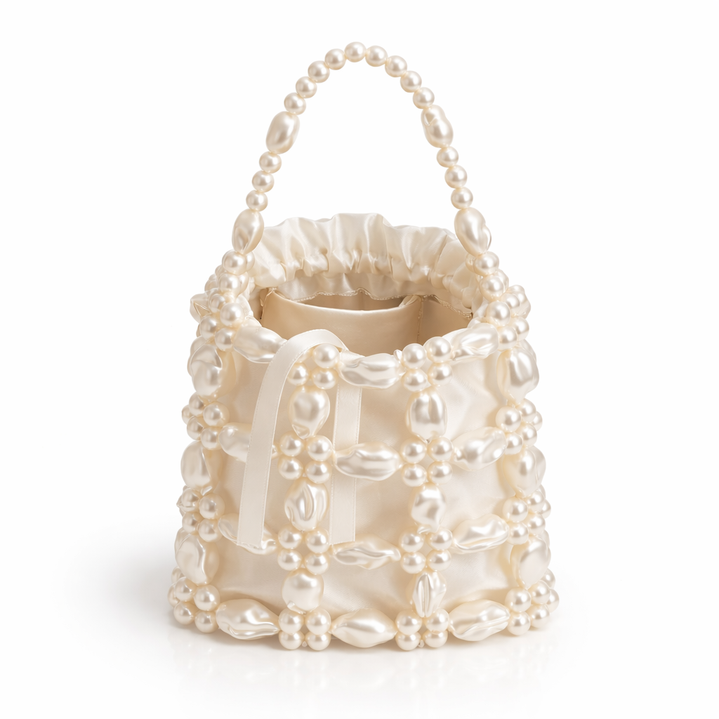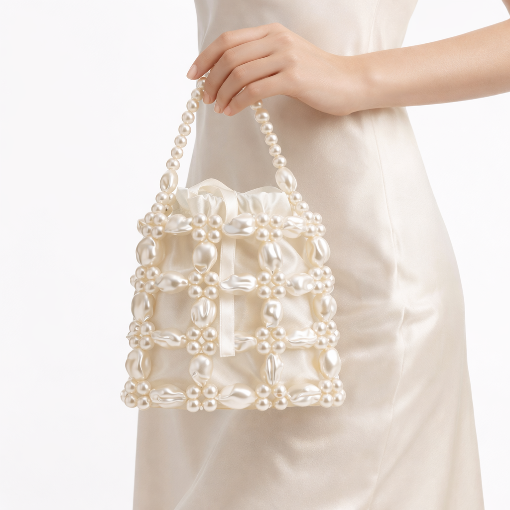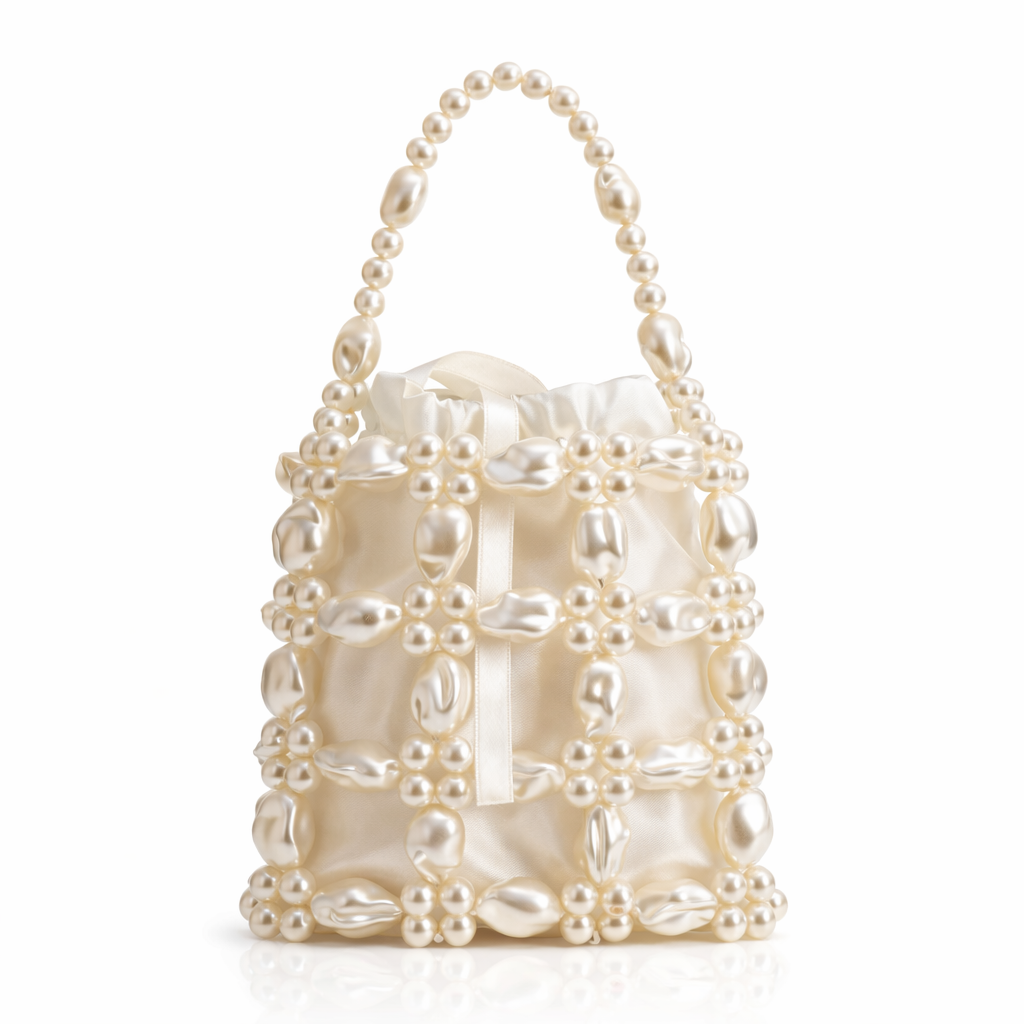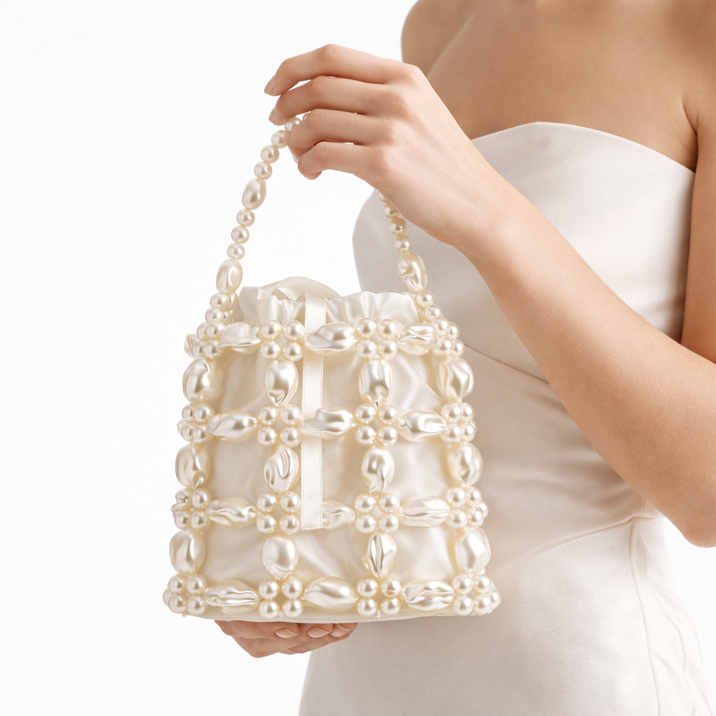 Gövde formu, krem tonlarında saten dokulu yumuşak bir iç kese etrafına, farklı form ve çaplarda seçilmiş doğal beyaz inci boncukların şeffaf monofilament misina ile tamamen el işçiliğiyle örülmesiyle oluşturulmuştur. İnci yüzey, kapalı ve ağır bir blok etkisi yaratmak yerine; düzenli aralıklarla nefes alan, ritmik bir kafes mimarisiyle kurgulanmıştır. Bu yapı, çantaya hem görsel hafiflik hem de üç boyutlu bir derinlik kazandırır.