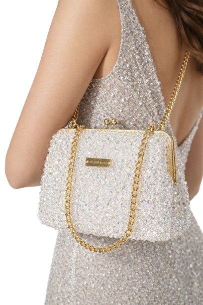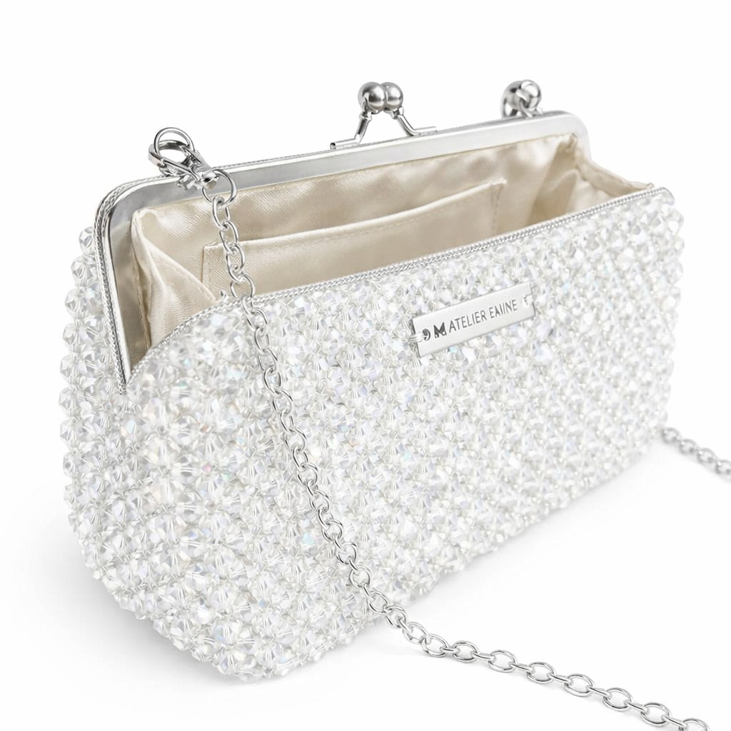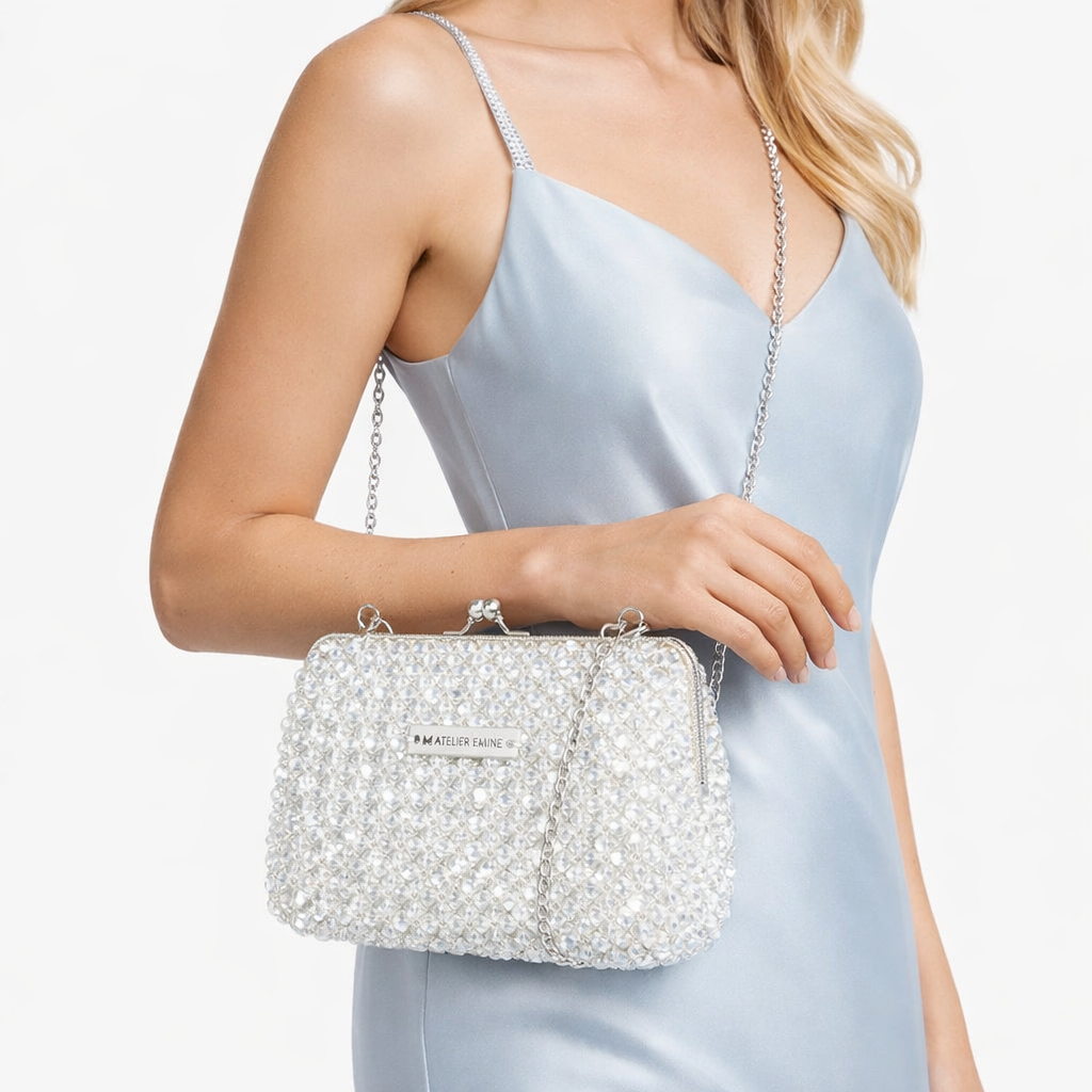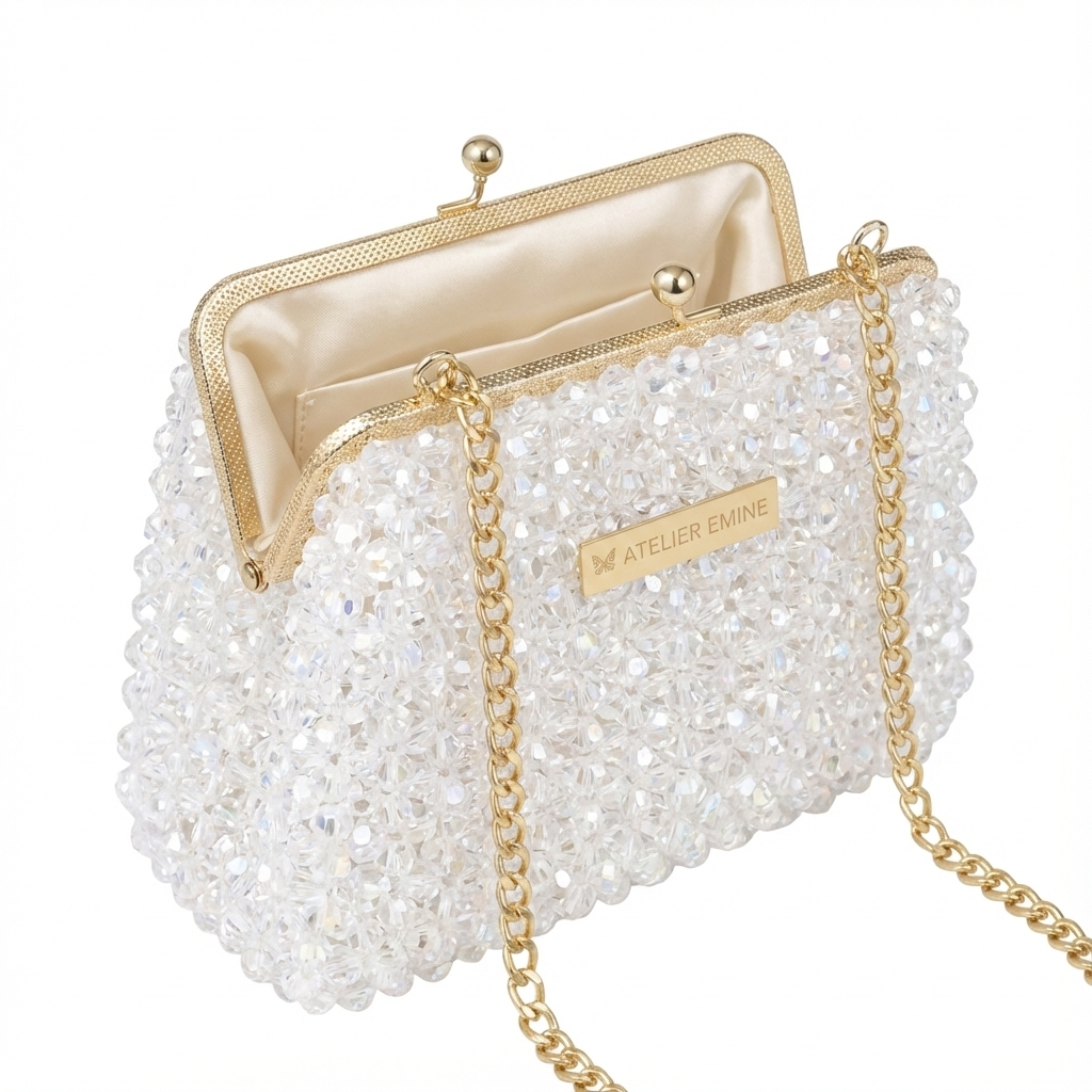 Atelier Emine’in Crystal Gelato Couture serisine ait bu tasarım; 8 mm optik sınıfı kristal boncuklar kullanılarak, tamamı el işçiliğiyle üretilmiş çerçeveli kapama sistemine sahip premium clutch çanta modelidir.
