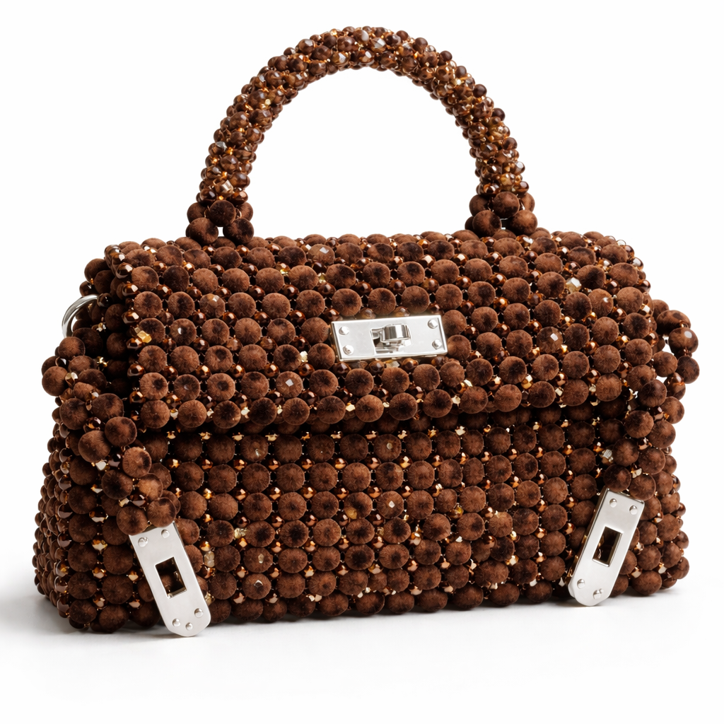 İç hacim, boncuk yüzeyle doğrudan teması engelleyen, pürüzsüz dokulu astarla kaplanmış; hem konforlu kullanım hem de uzun ömürlü yapı hedeflenmiştir. Vélis Mahogany, elde taşınabilir formu ve couture seviyesindeki işçilik yoğunluğuyla Velvet Noir Couture koleksiyonunun güçlü ve sofistike statement parçalarından biridir.