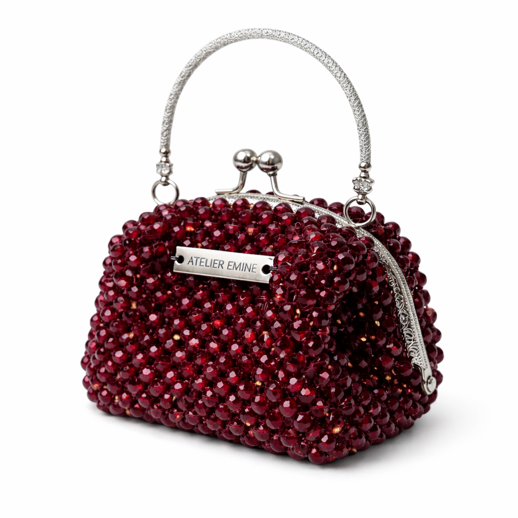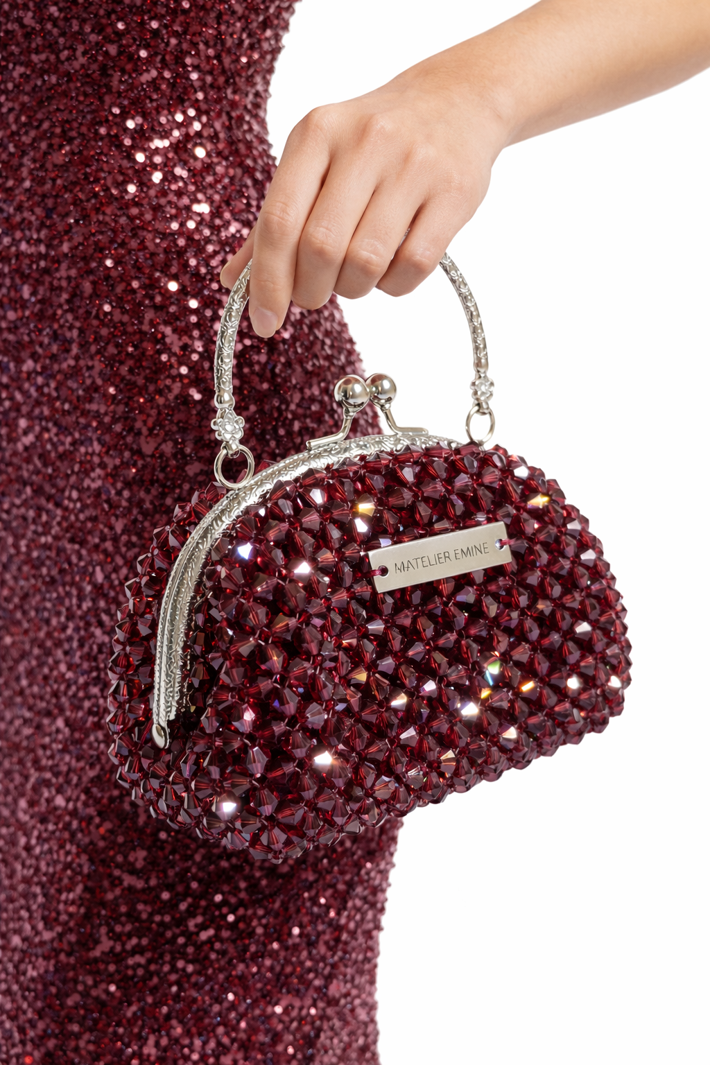 Affogato Granata , from Atelier Emine's Crystal Gelato Couture collection, is a premium mini bag model crafted from 8mm optical-grade crystal beads individually woven with high-strength fishing line, and features a metal frame.