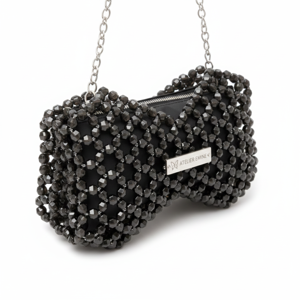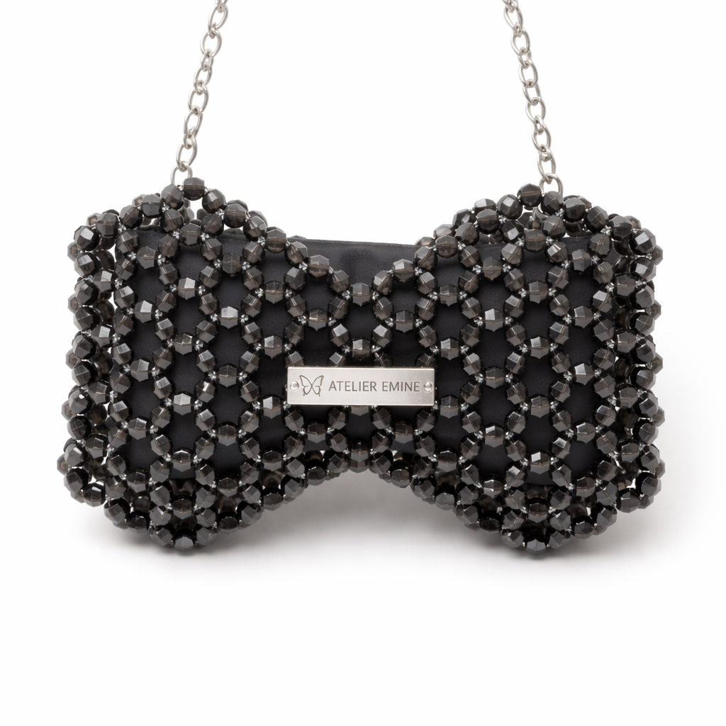 The Fresco Cendré from Atelier Emine's Crystal Gelato Couture series is a sculptural mini bag in the shape of a bow, entirely handcrafted by weaving 8 mm optical-grade crystal beads with high-strength fishing line.