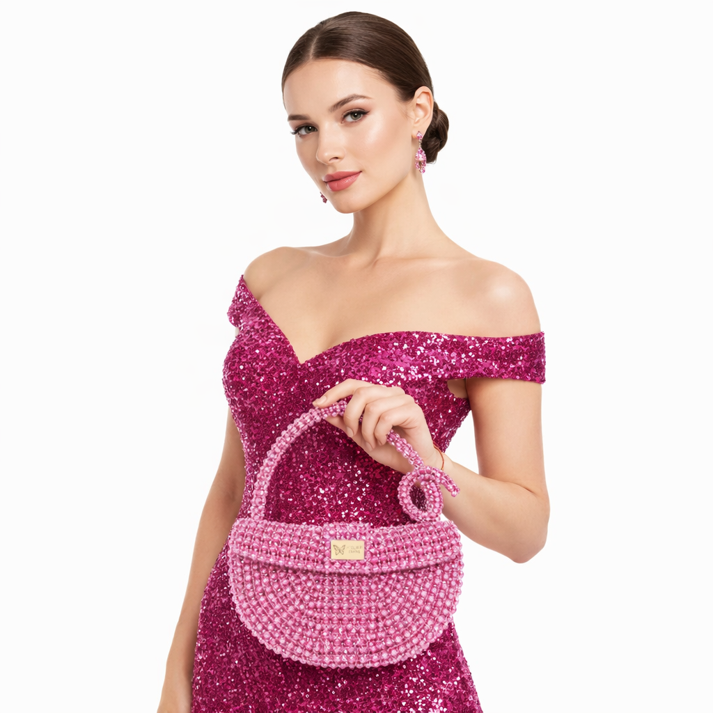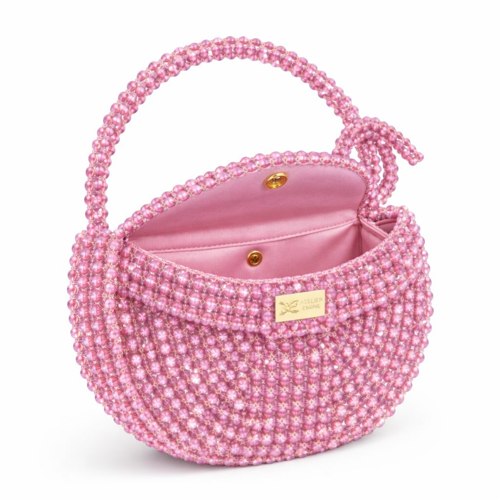 Melo Cotton , from Atelier Emine's Crystal Gelato Couture series, is a premium mini bag in a crescent shape, entirely handcrafted by weaving 8 mm optical-grade crystal beads with high-strength fishing line.