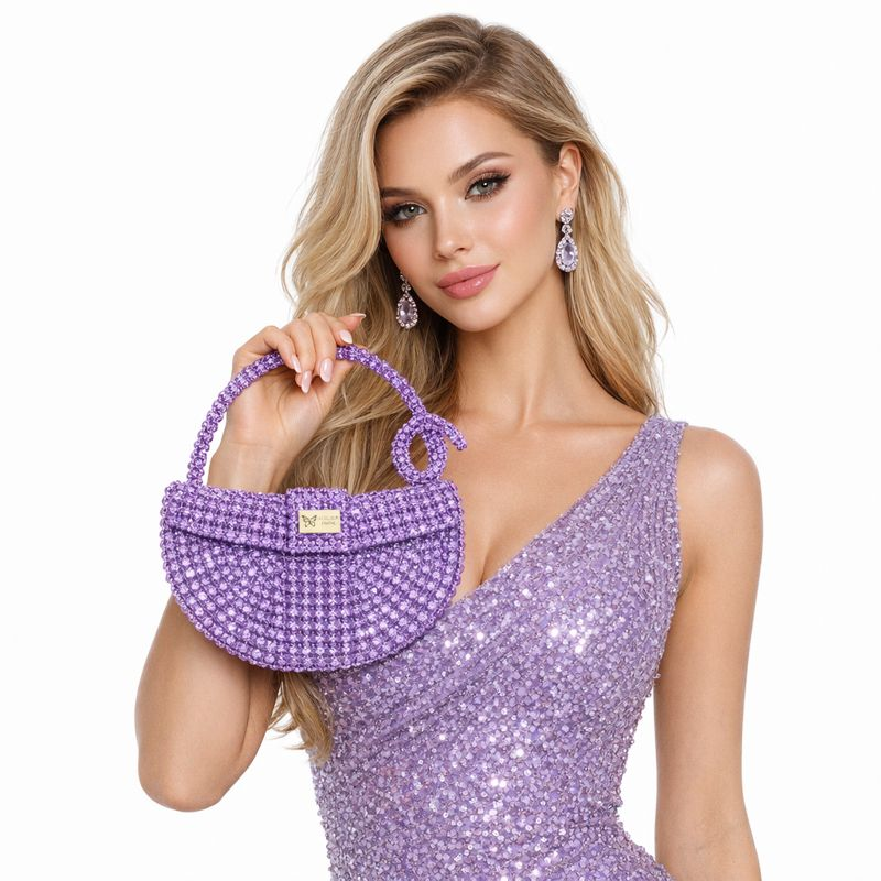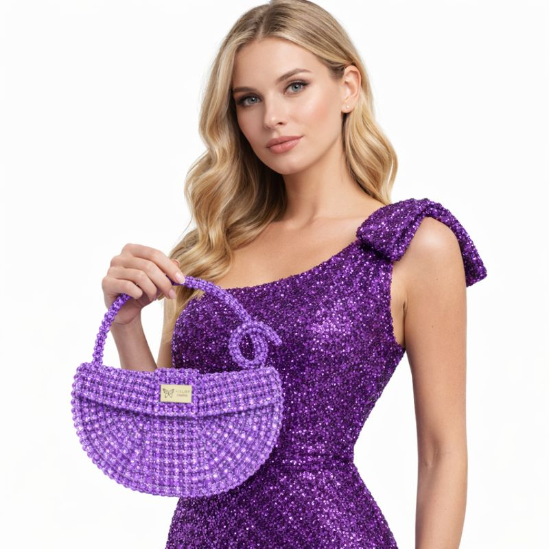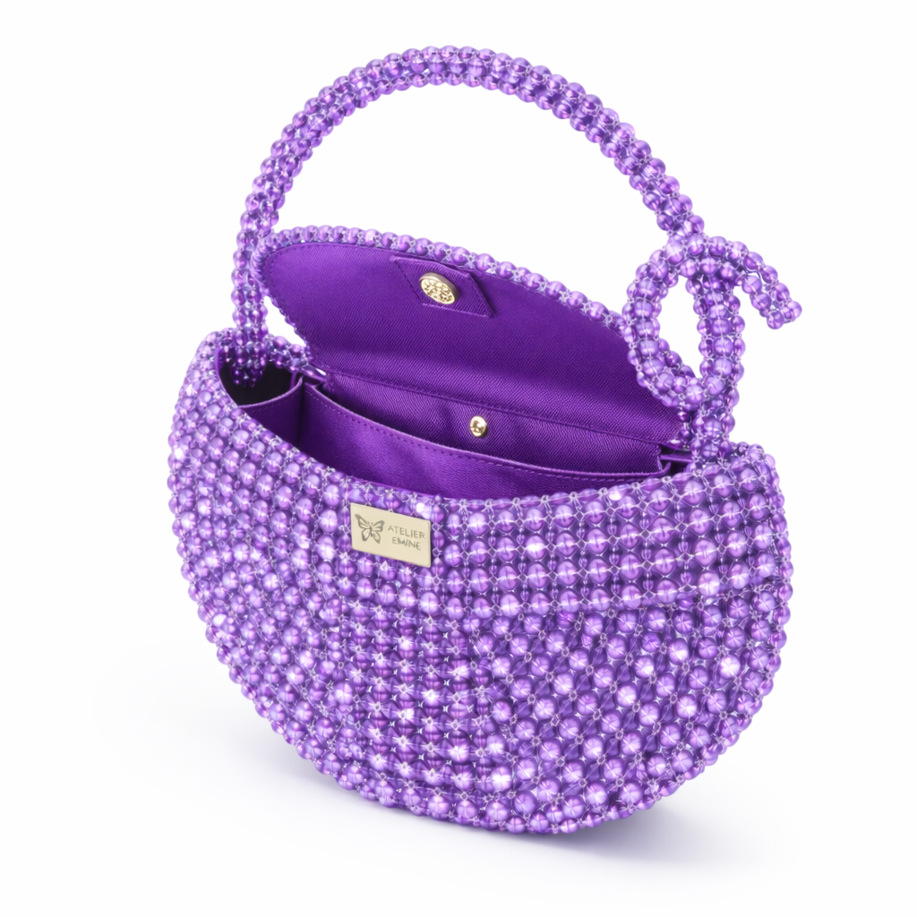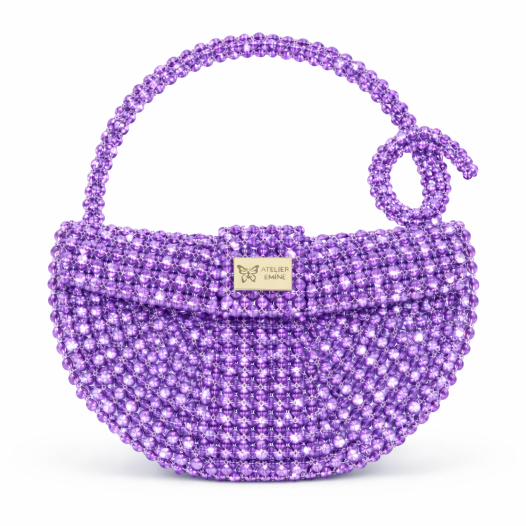 Melo Viola , from Atelier Emine's Crystal Gelato Couture series, is a premium mini handbag in a crescent shape, entirely handcrafted by weaving 8 mm optical-grade crystal beads with high-strength fishing line.