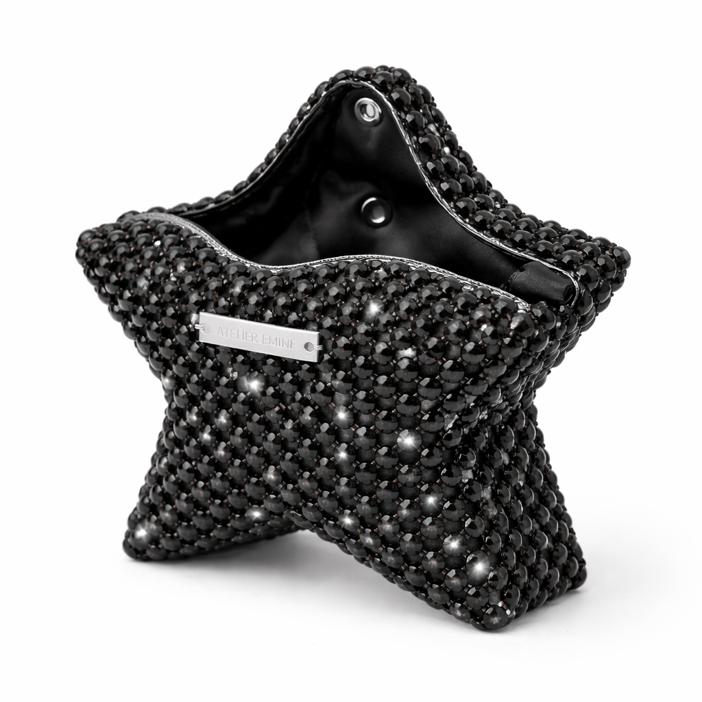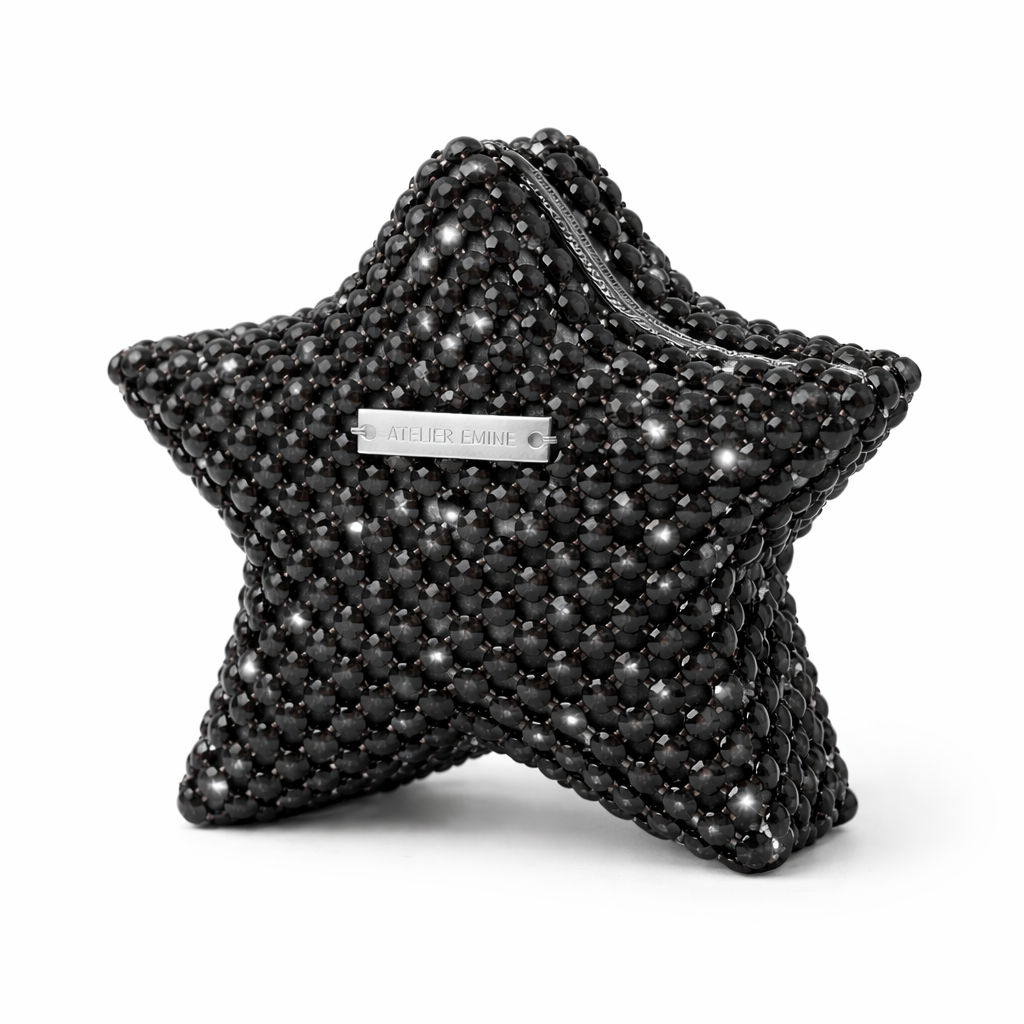 Mielo Liquirizia , from Atelier Emine's Crystal Gelato Couture series, is a premium mini clutch model with sculptural qualities, designed based on a three-dimensional star form; it is produced by individually weaving 8 mm optical-grade crystal beads with high-strength fishing line.