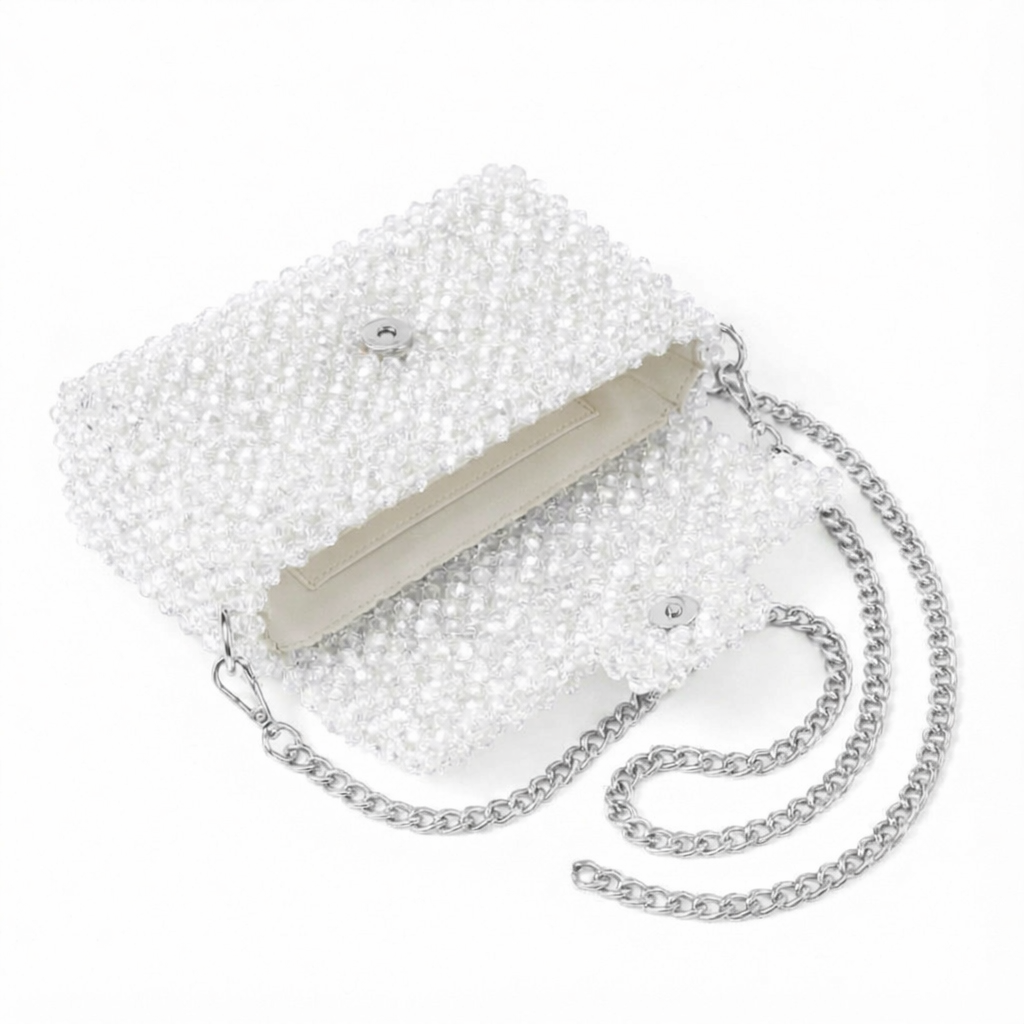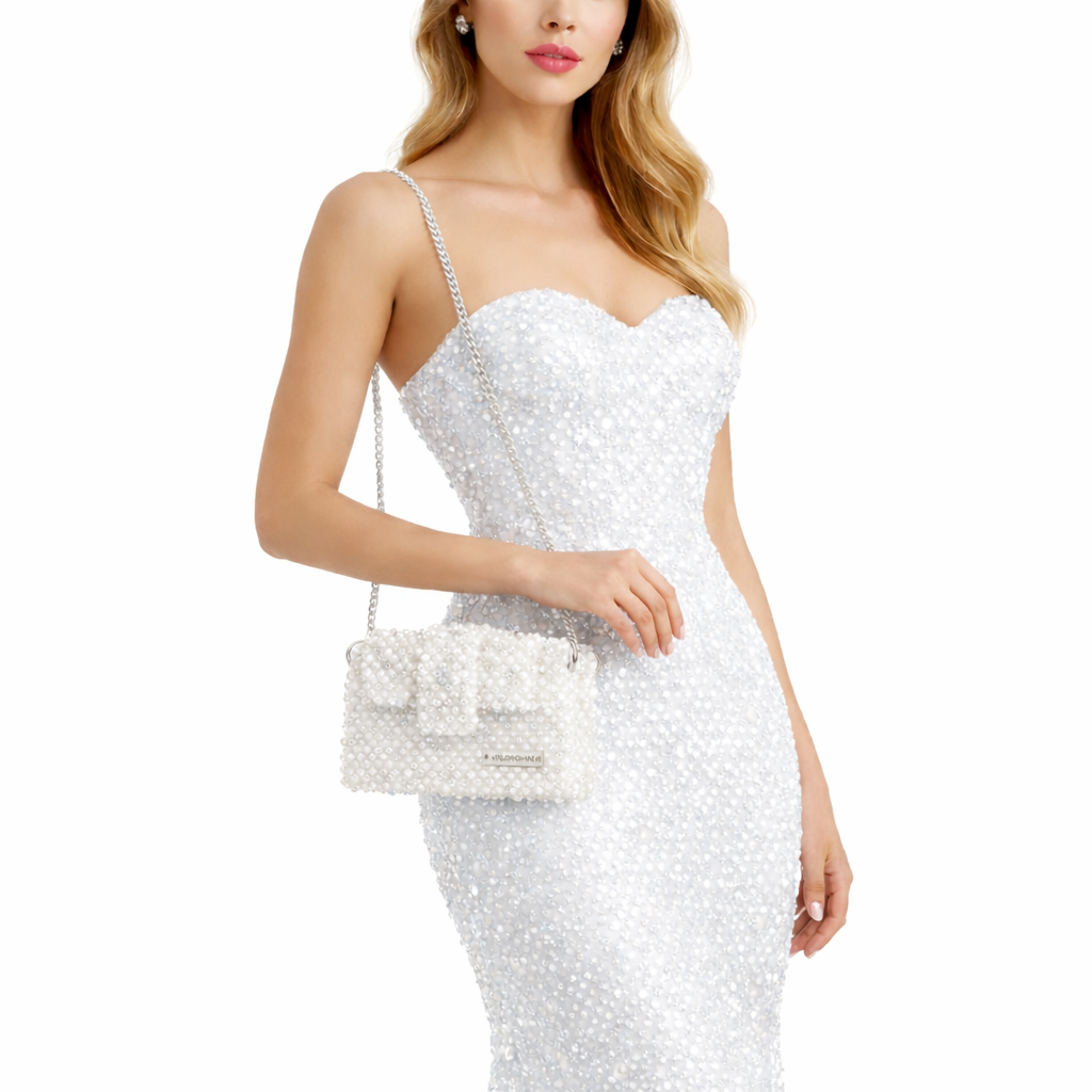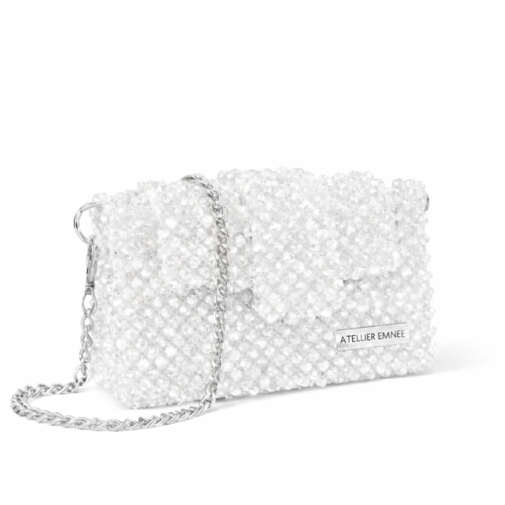 Panna Marble, from Atelier Emine's Crystal Gelato Couture series, is a premium clutch model entirely handcrafted using 8 mm optical-grade crystal beads, a metal shoulder chain, and a satin lining.