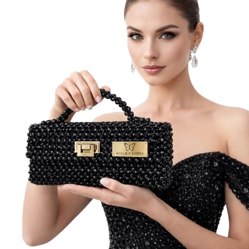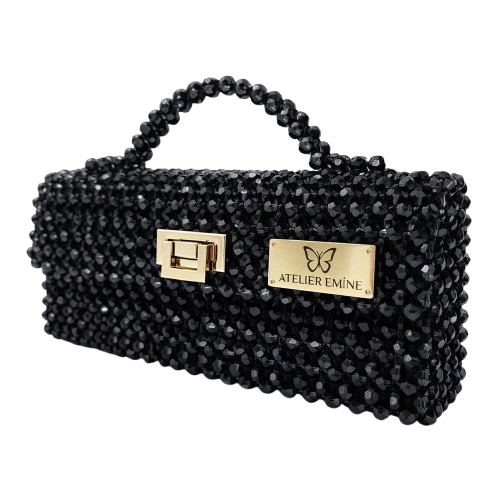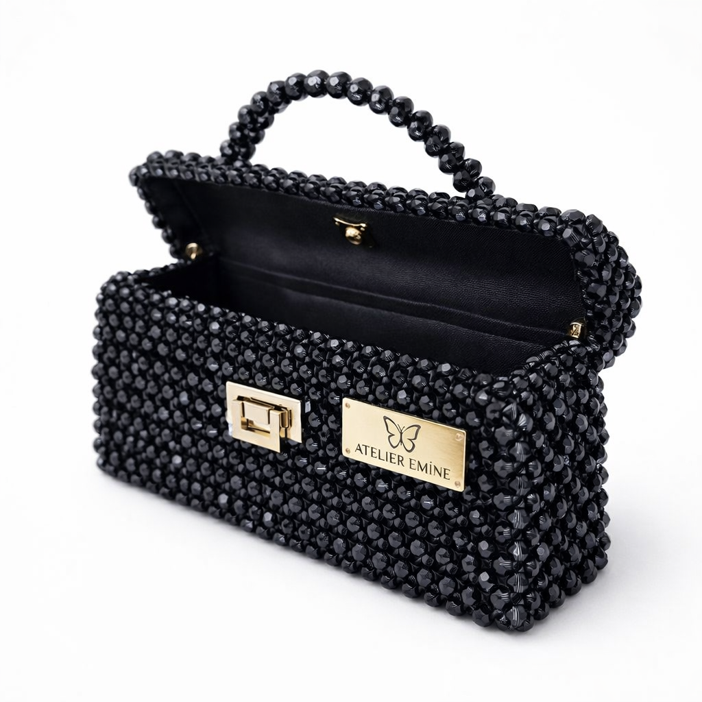 The Panna Midnight, from Atelier Emine's Crystal Gelato Couture series, is a premium top-handle clutch entirely handcrafted using 8 mm optical-grade crystal beads, a top carrying handle, a metal clasp, and a satin lining.