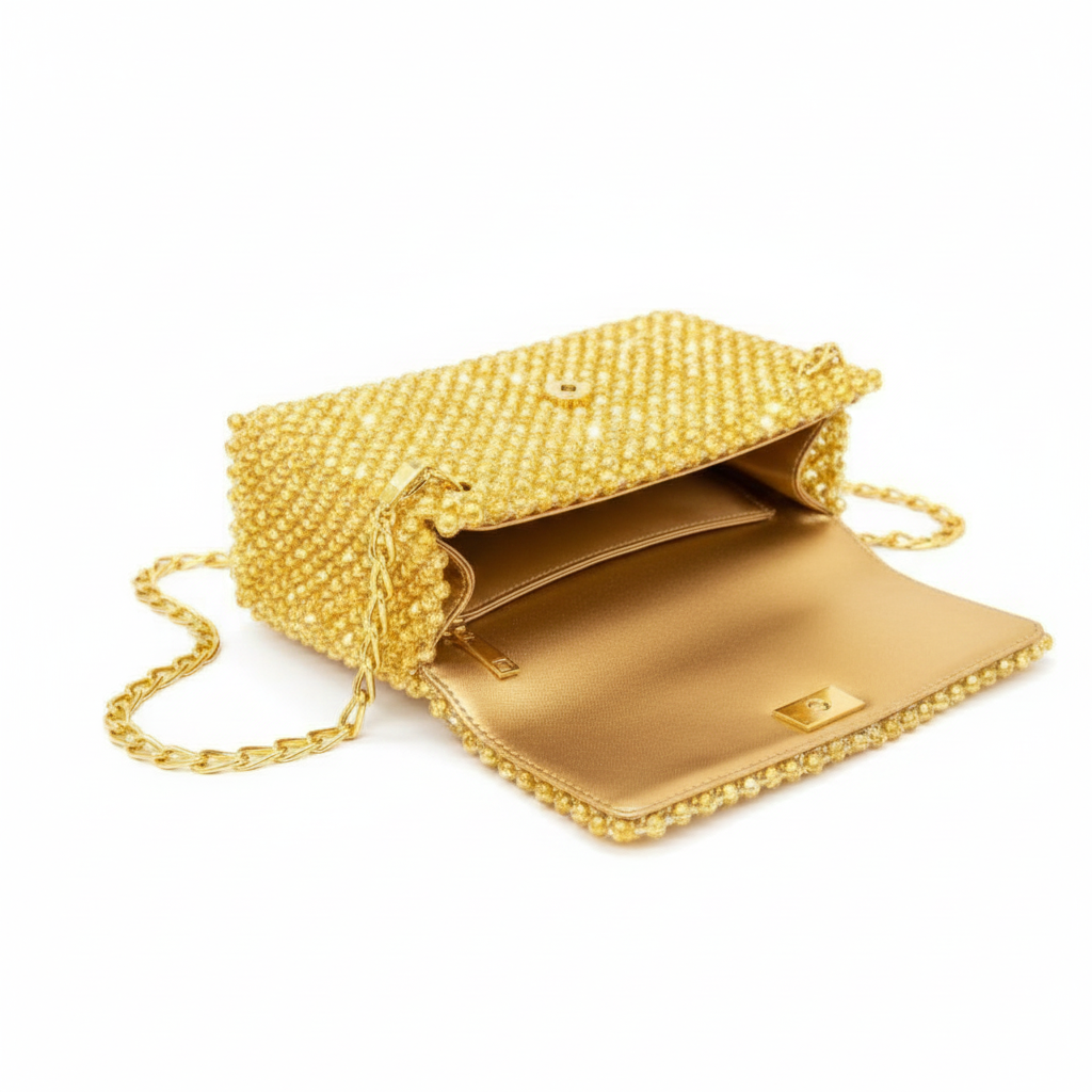 The Panna Miele, from Atelier Emine's Crystal Gelato Couture series, is a premium clutch model entirely handcrafted using 8 mm optical-grade crystal beads, a metal shoulder chain, and a satin lining.