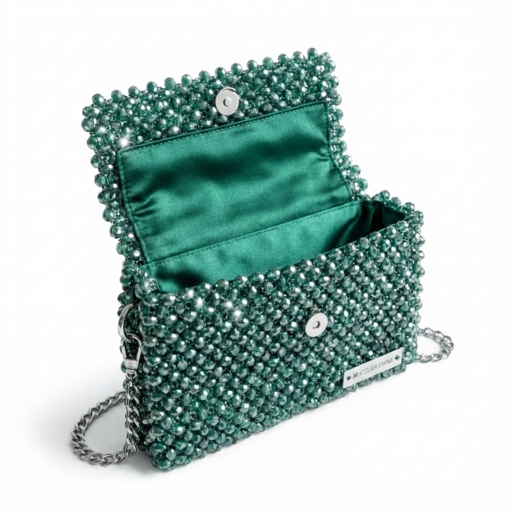 Panna Verde , from Atelier Emine's Crystal Gelato Couture collection, is a premium mini bag model in a rectangular shape, crafted by individually weaving 8 mm optical-grade crystal beads with high-strength fishing line.