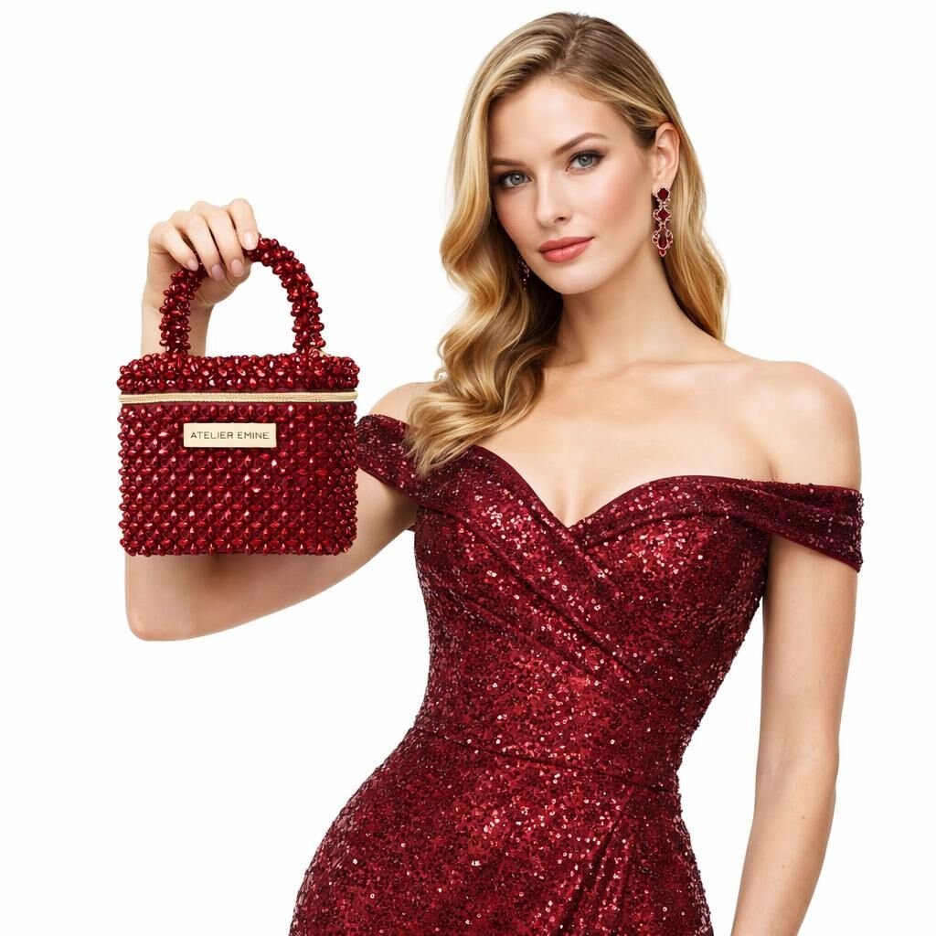 Crystal beads are individually woven with high-strength fishing line to create a compact body structure with a flat surface and clearly defined corners. This structure ensures the bag maintains its geometric form for a long time while supporting the homogeneous surface integrity of the crystal weave.