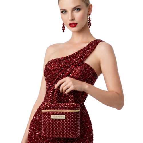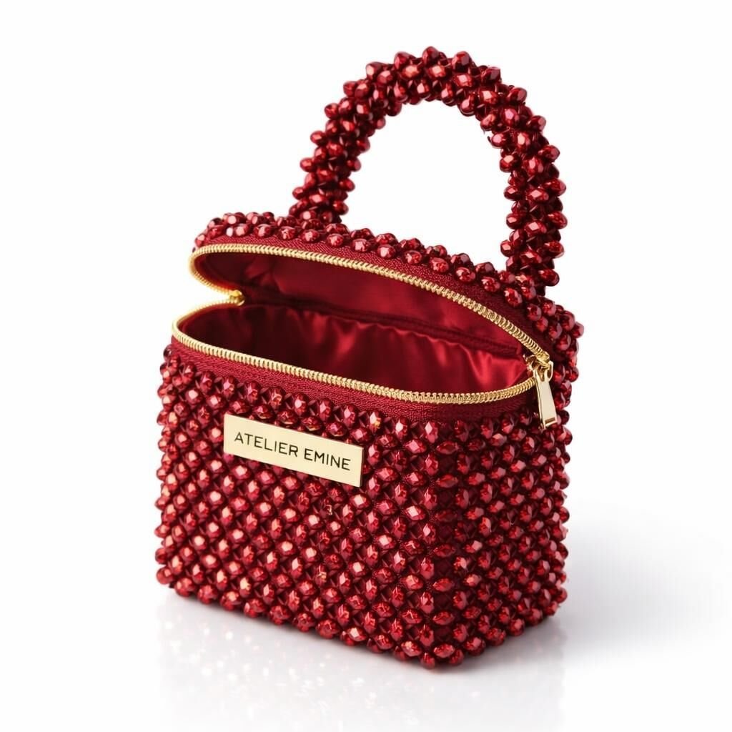 This design from Atelier Emine's Crystal Gelato Couture series is a premium mini bag in a box form , entirely handcrafted using 8 mm optical grade crystal beads.