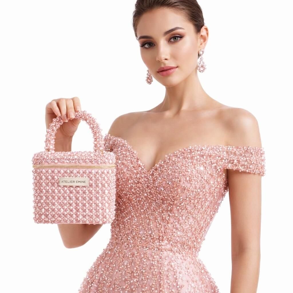 This design from Atelier Emine's Crystal Gelato Couture series is a premium mini bag in a box form , entirely handcrafted using 8 mm optical grade crystal beads.