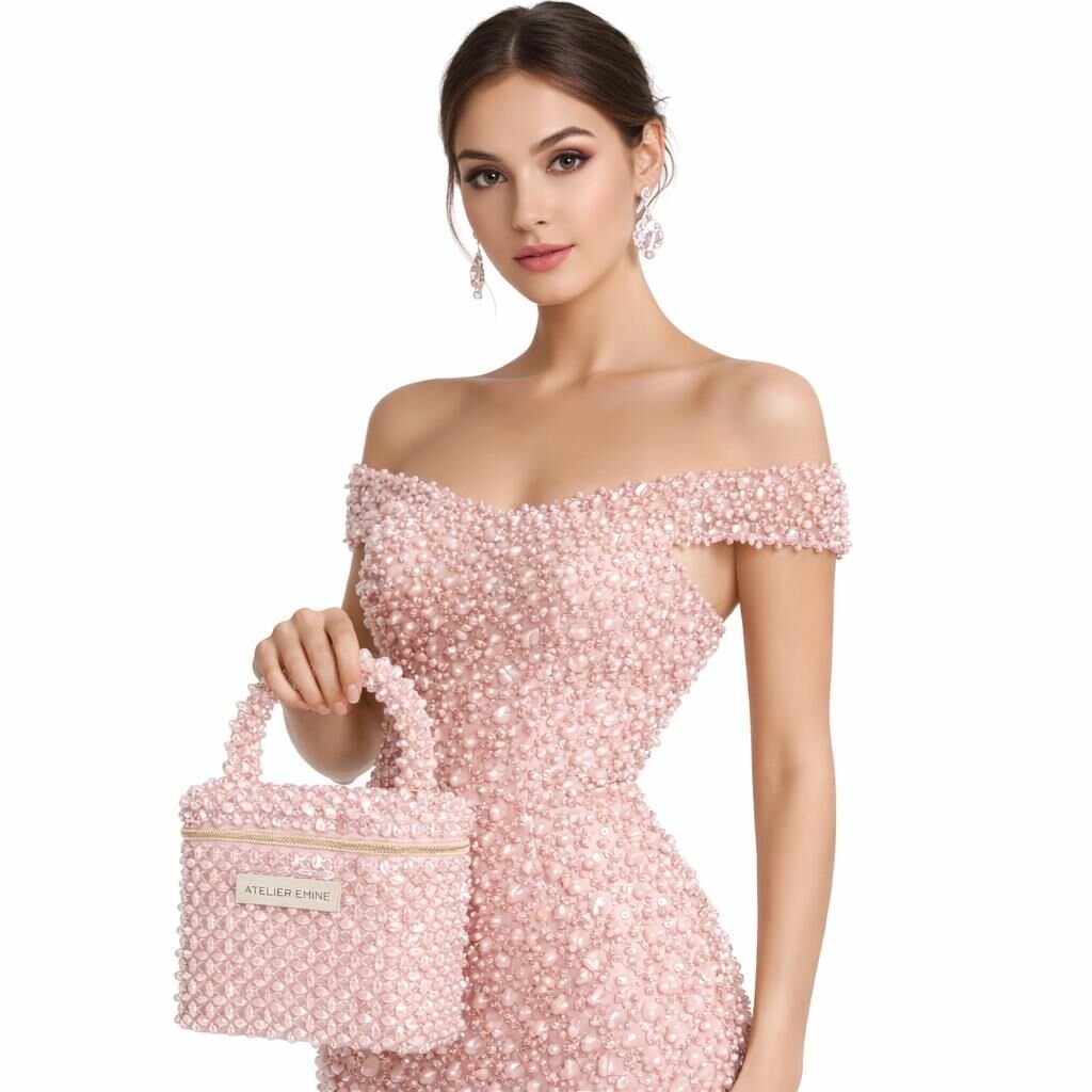 Crystal beads are individually woven with high-strength fishing line to create a compact body structure with a flat surface and clearly defined corners. This structure ensures the bag maintains its geometric form for a long time while supporting the homogeneous surface integrity of the crystal weave.