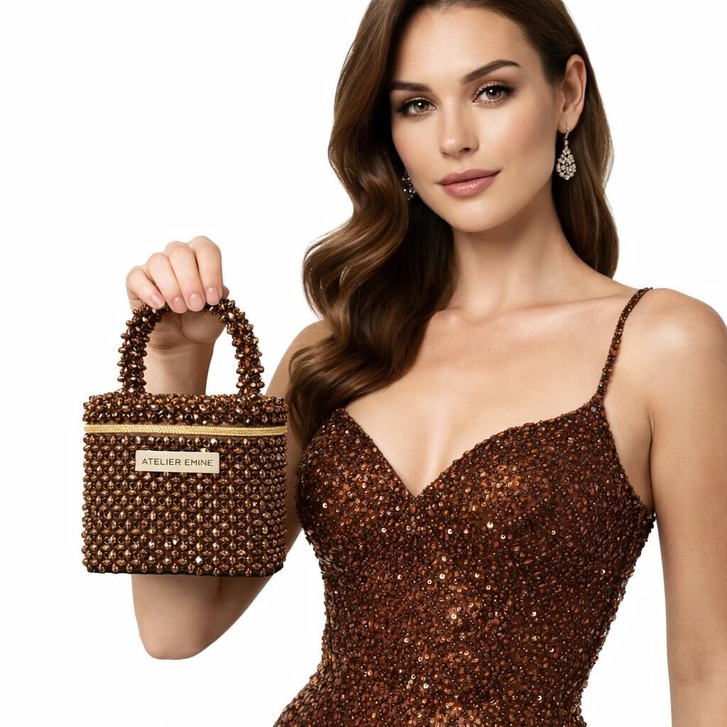 Crystal beads are individually woven with high-strength fishing line to create a compact body structure with a flat surface and clearly defined corners. This structure ensures the bag maintains its geometric shape for a long time while supporting the homogeneous surface integrity of the crystal weave.
