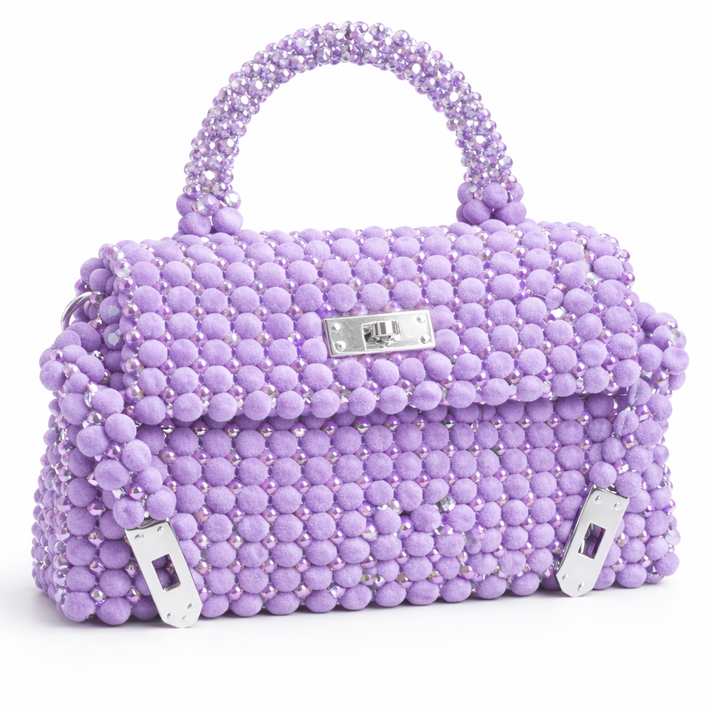 Vélis Amethyst , from Atelier Emine's Velvet Noir Couture series, is a high-craftsmanship couture bag designed with a densely textured structure created by weaving micro-beads with a velvet surface using fishing line, and then interspersed with spaced multi-faceted crystal beads.