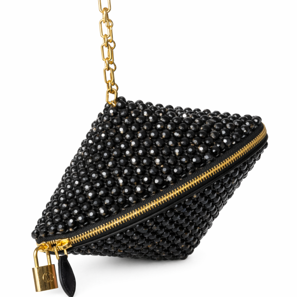 The bag body is entirely handcrafted, created by individually weaving 8 mm standard round-cut optical-grade crystal beads using high-strength monofilament fishing line to create a high-density surface weave . The tight and controlled arrangement of the crystals provides a homogeneous brilliance across the surface, while light refractions are distributed on a micro-scale, creating a sophisticated sense of depth.
