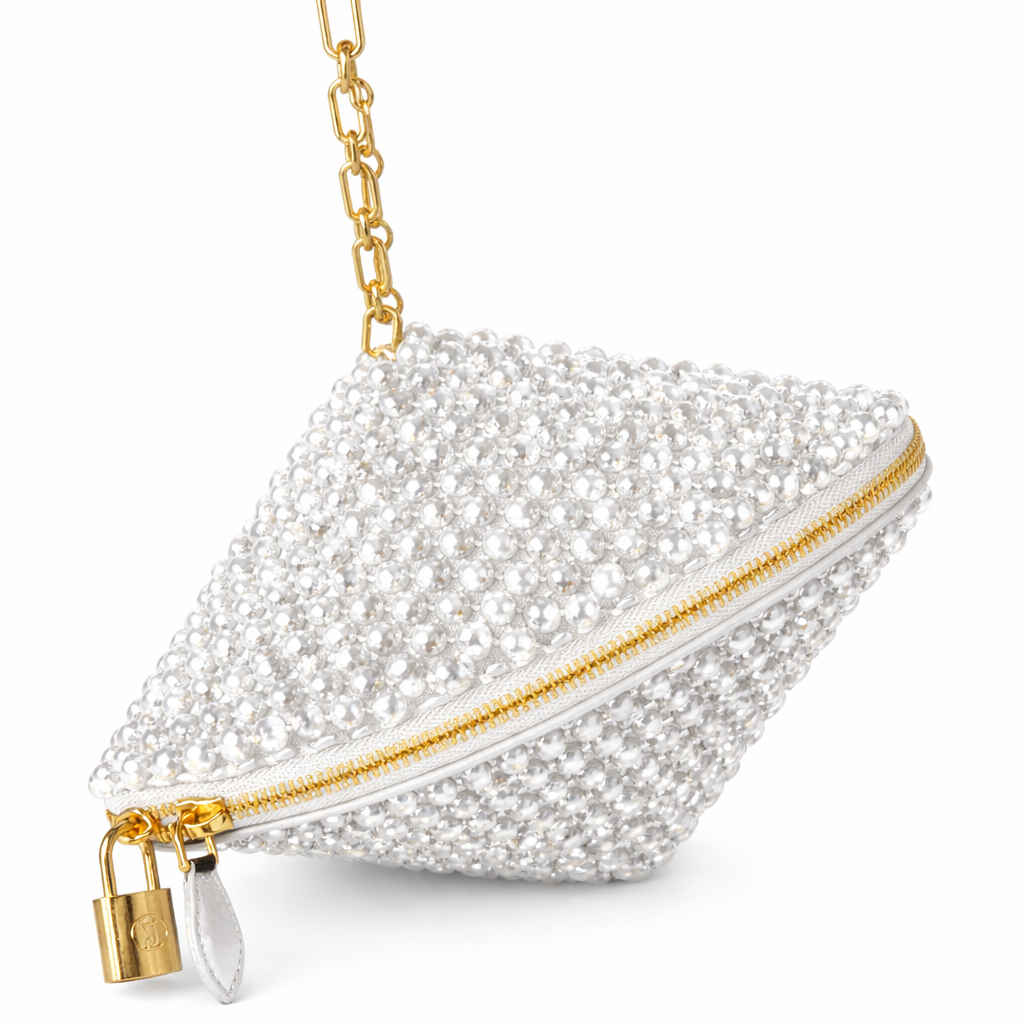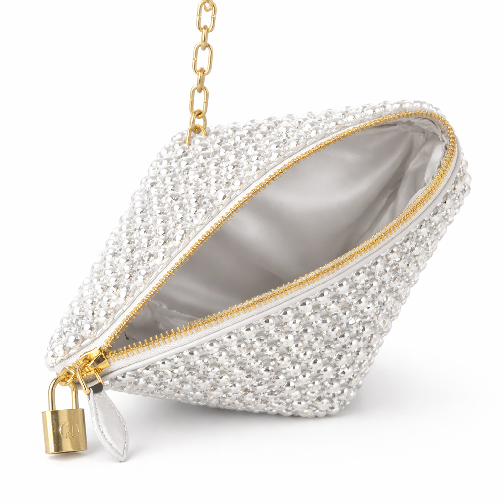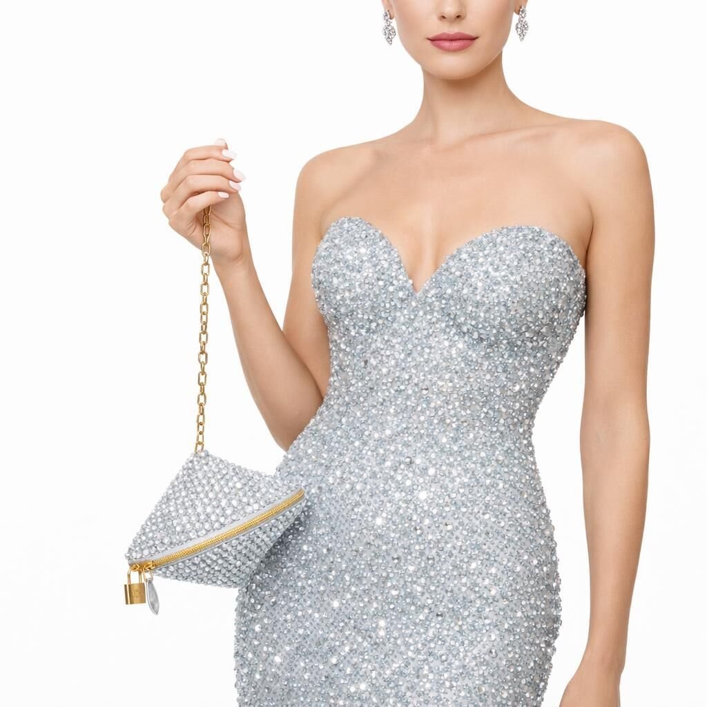 The metal-toothed zipper system located at the top complements the couture character of the design with industrial precision. The zipper line is seamlessly aligned with the crystal surface, offering functional security without disrupting visual continuity. The metal accessory with a lock detail at the end of the zipper adds a powerful, jewel-like emphasis to the design.
