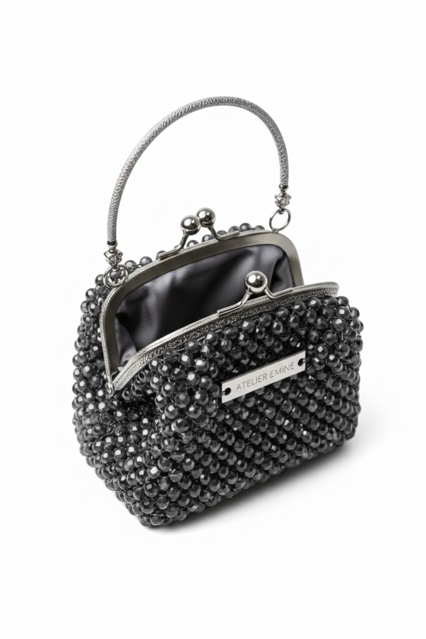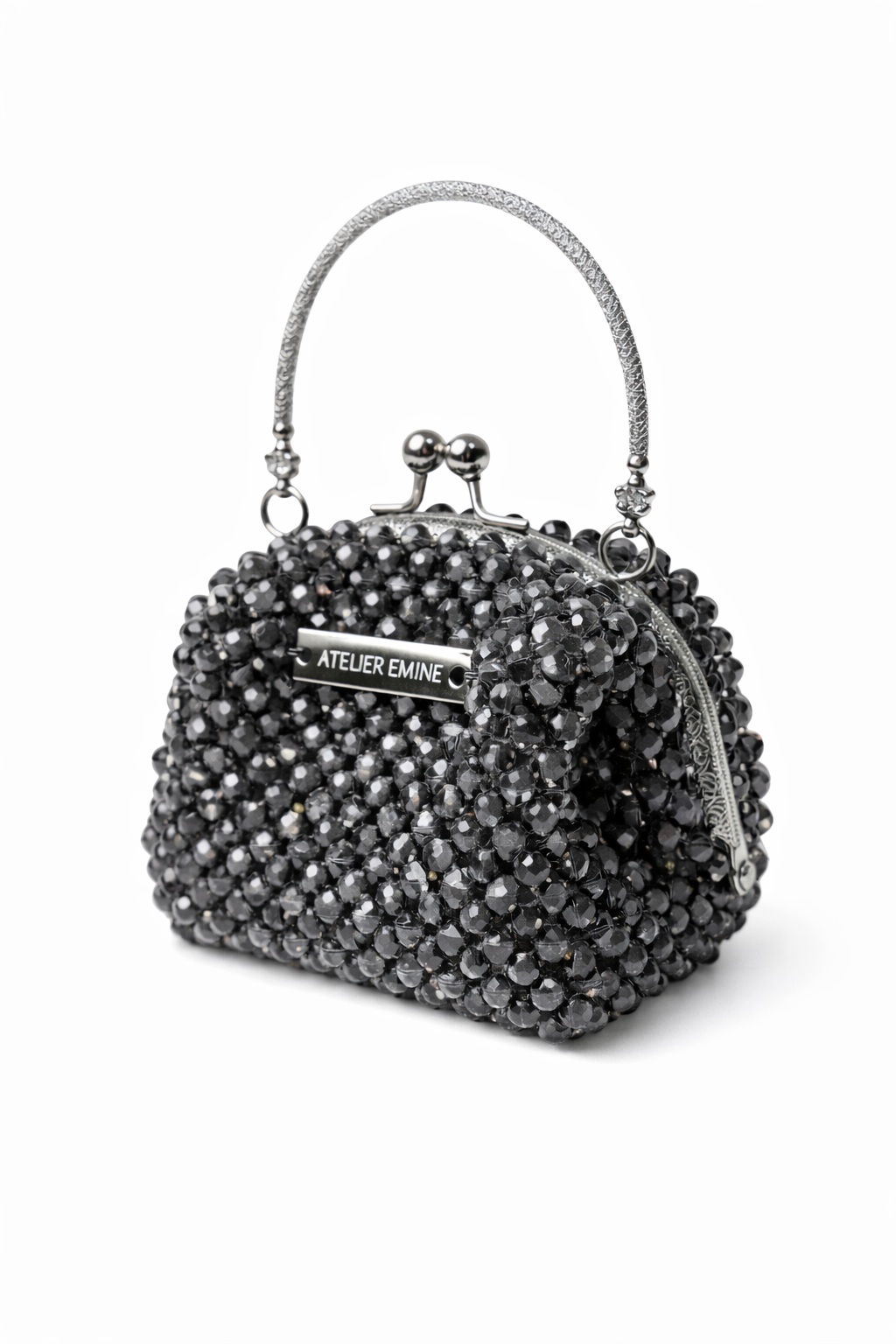 Atelier Emine’in Crystal Gelato Couture koleksiyonuna ait Affogato Carbon, 8 mm optik sınıfı kristal boncukların yüksek dayanımlı misina ile tek tek örülmesiyle üretilmiş, metal çerçeve yapıya sahip premium mini çanta modelidir.
