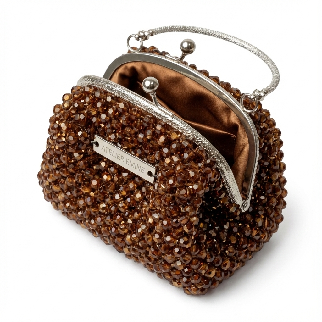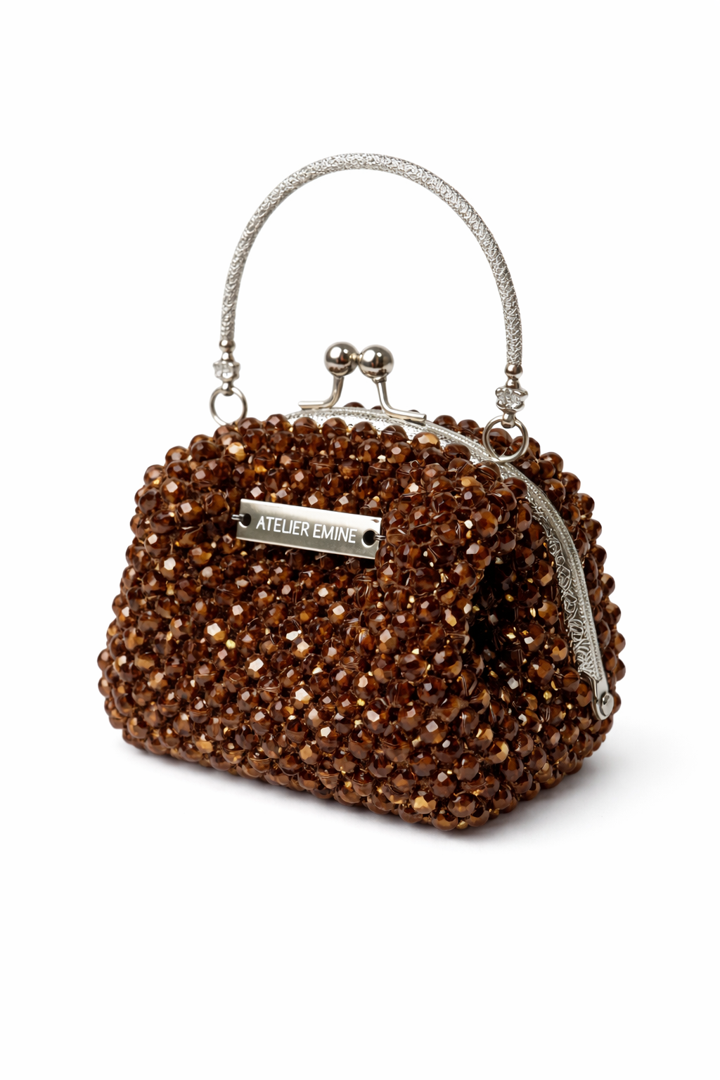 Atelier Emine’in Crystal Gelato Couture koleksiyonuna ait Affogato Mocha, 8 mm optik sınıfı kristal boncukların yüksek dayanımlı misina ile tek tek örülmesiyle üretilmiş, metal çerçeve yapıya sahip premium mini çanta modelidir.