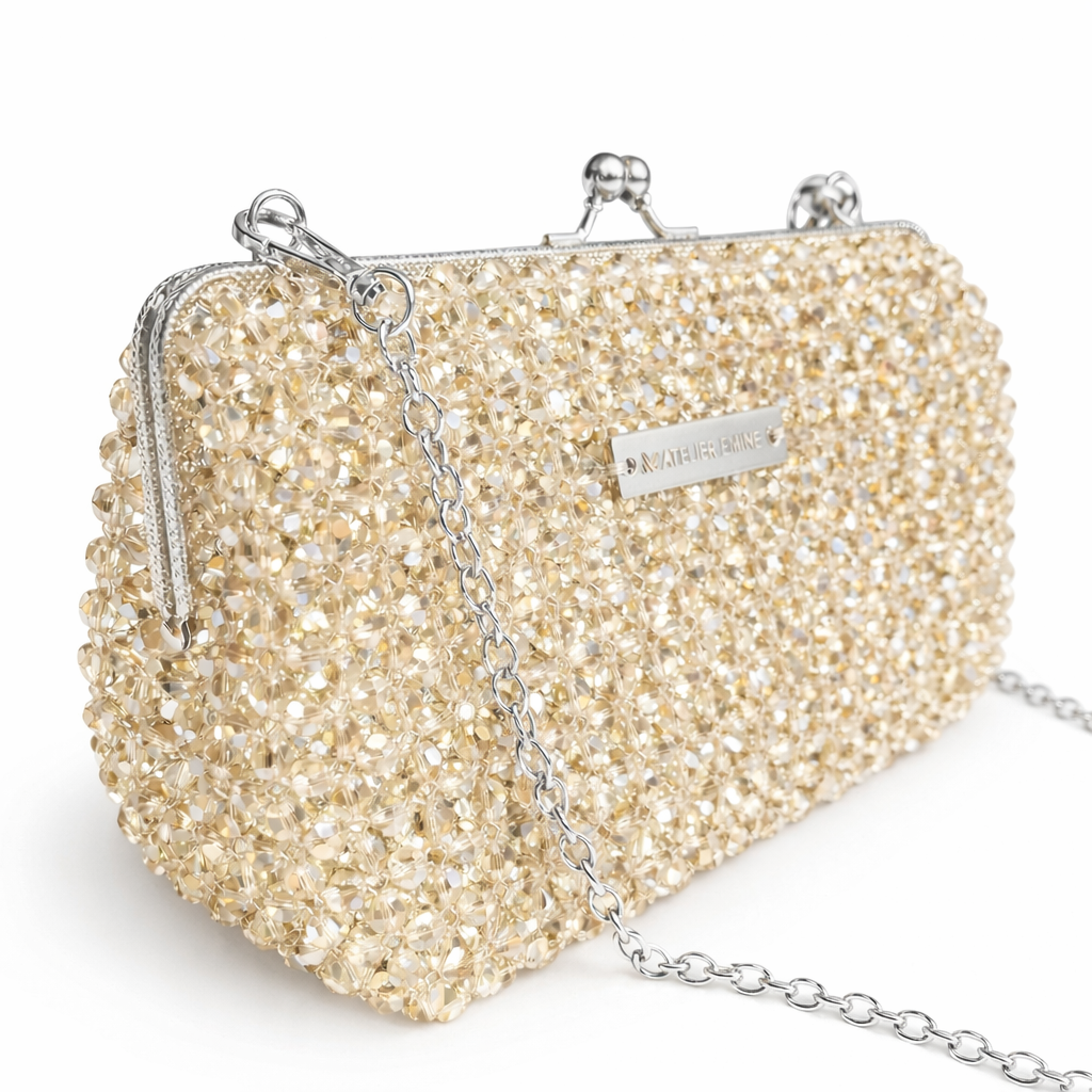 Atelier Emine’in Crystal Gelato Couture serisine ait bu tasarım; 8 mm optik sınıfı kristal boncuklar kullanılarak, tamamı el işçiliğiyle üretilmiş çerçeveli kapama sistemine sahip premium clutch çanta modelidir.