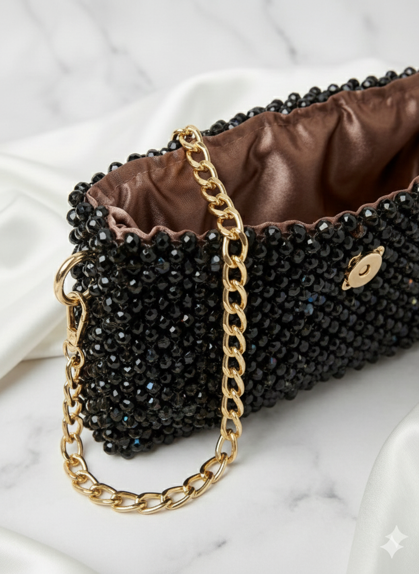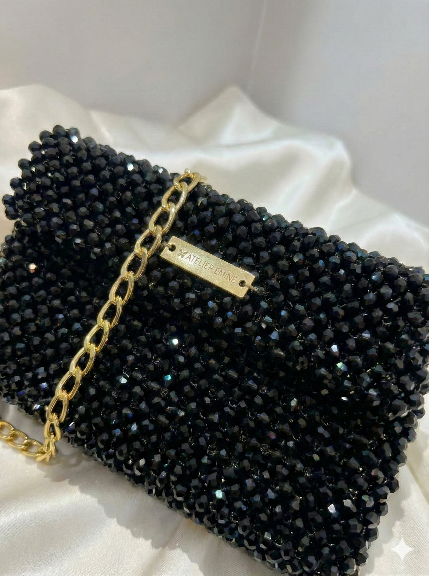 Atelier Emine’in Crystal Gelato Couture serisine ait Black Truffle Noir, 8 mm optik sınıfı kristal boncuklar, 316L paslanmaz çelik kulp ve saten astar kullanılarak tamamen el işçiliğiyle üretilmiş premium clutch modelidir.