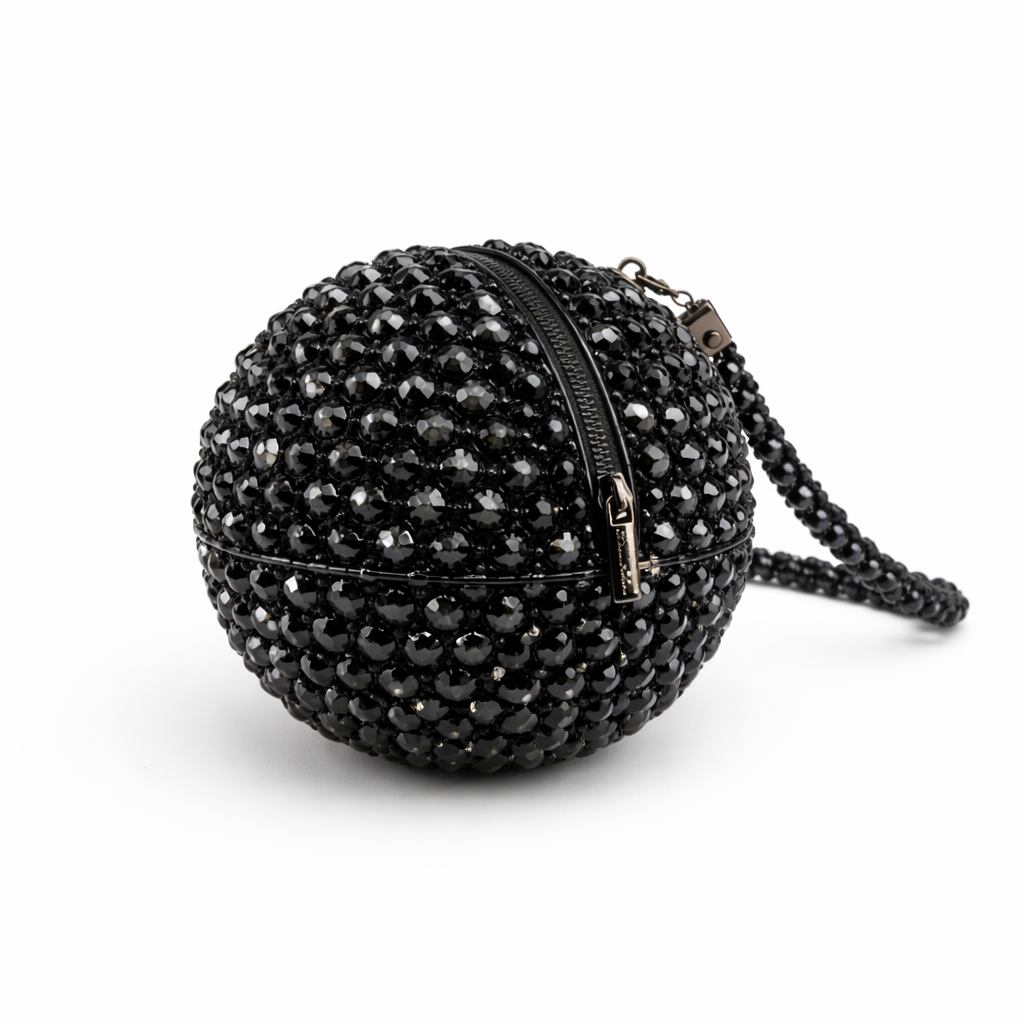 Modelin üst bölümünde yer alan metal fermuarlı kapatma sistemi, küresel yapıya entegre edilerek tasarlanmış; fermuar hattı, form bütünlüğünü bozmadan çantanın çevresini takip edecek şekilde konumlandırılmıştır. Fermuar çekme ucu ve metal aksesuarlar, kristal dokuyla kontrast oluşturmadan, dengeli bir parlaklık sunar.