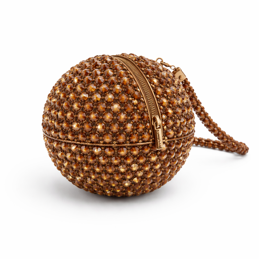 Atelier Emine’in Crystal Gelato Couture serisine ait Brio Walnut, 8 mm optik sınıfı, çok yüzeyli kristal boncukların yüksek dayanımlı monofilament misina ile tek tek örülmesiyle üretilmiş; küresel formda, yüksek işçilik yoğunluğuna sahip premium mini çanta tasarımıdır.