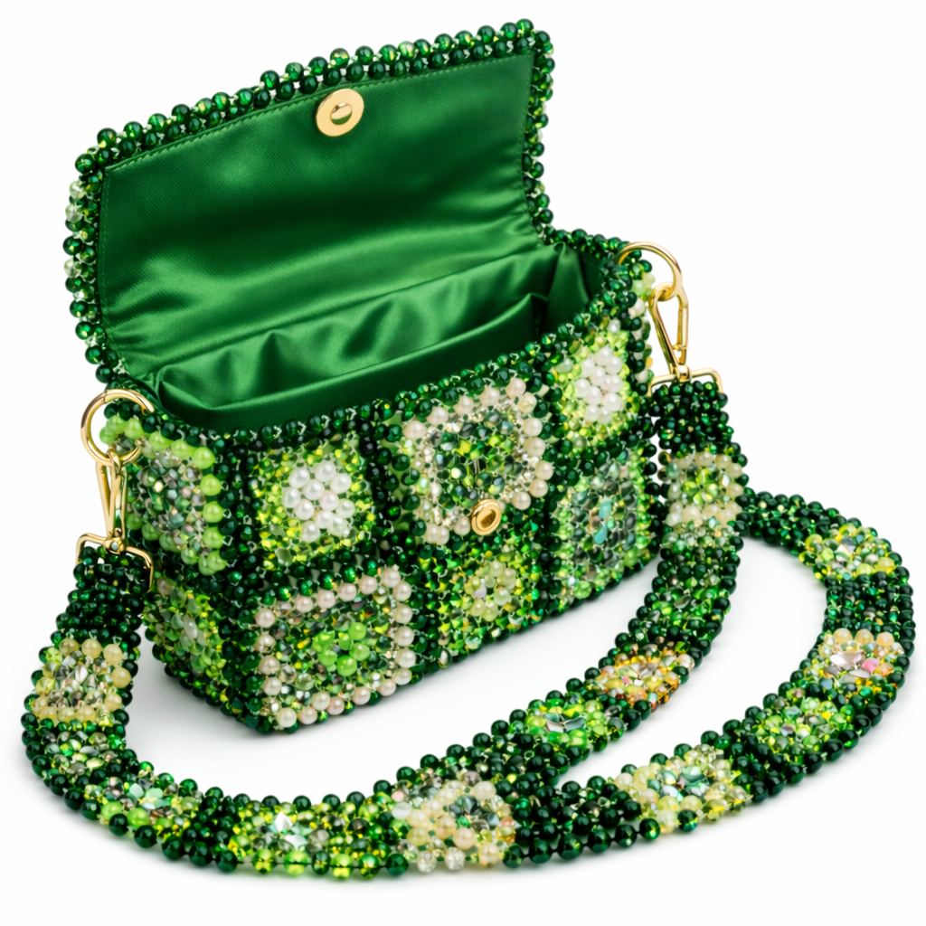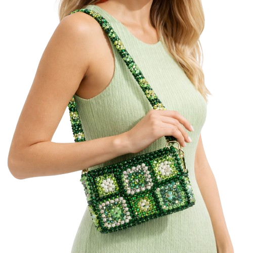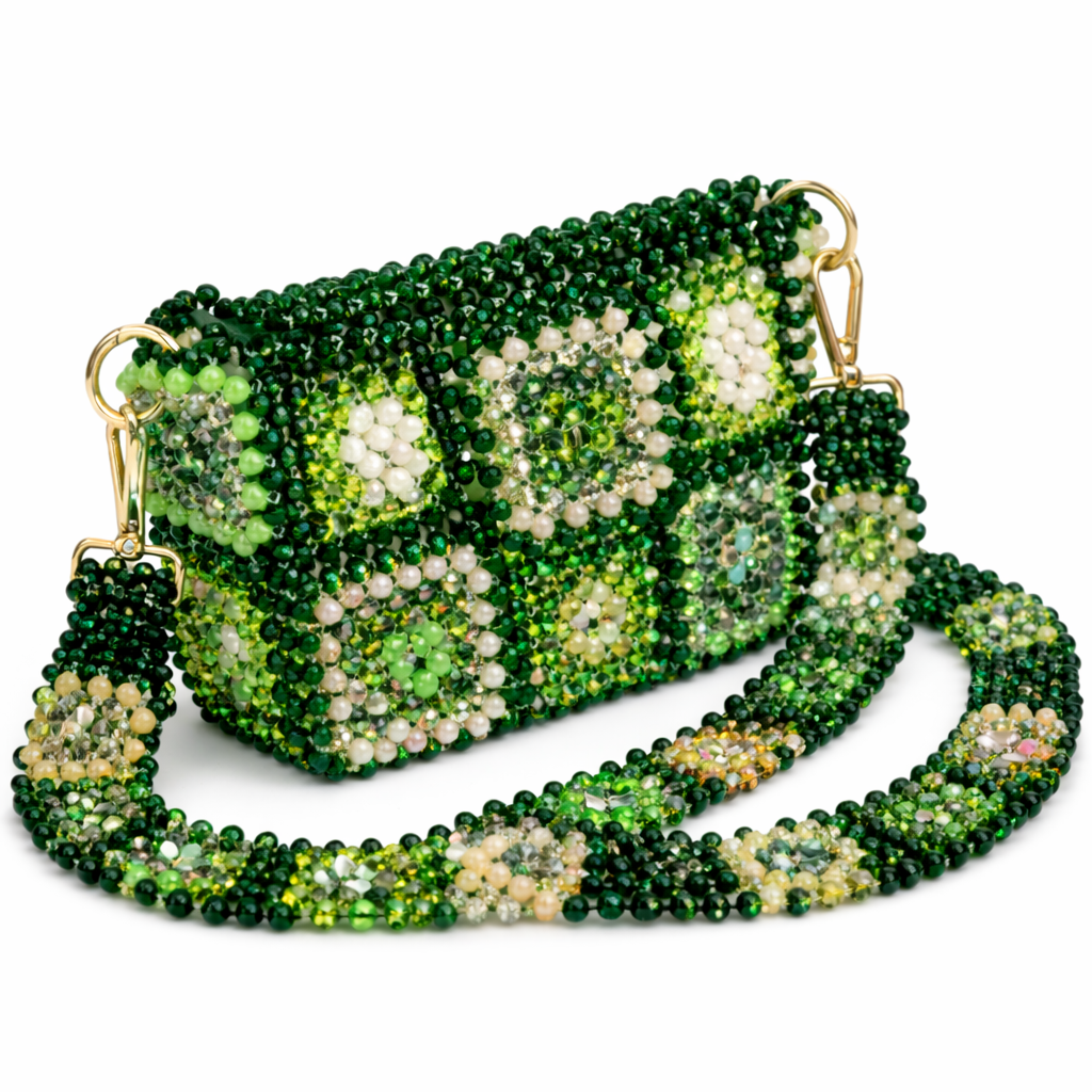 Atelier Emine’in Crystal Gelato Couture koleksiyonuna ait Budino Verdelune, 8 mm optik sınıfı çok yüzeyli kristal boncukların yüksek dayanımlı misina ile tek tek örülmesiyle tamamen el işçiliğiyle üretilmiş, modüler yüzey kurgusuna sahip premium mini omuz çantası modelidir.