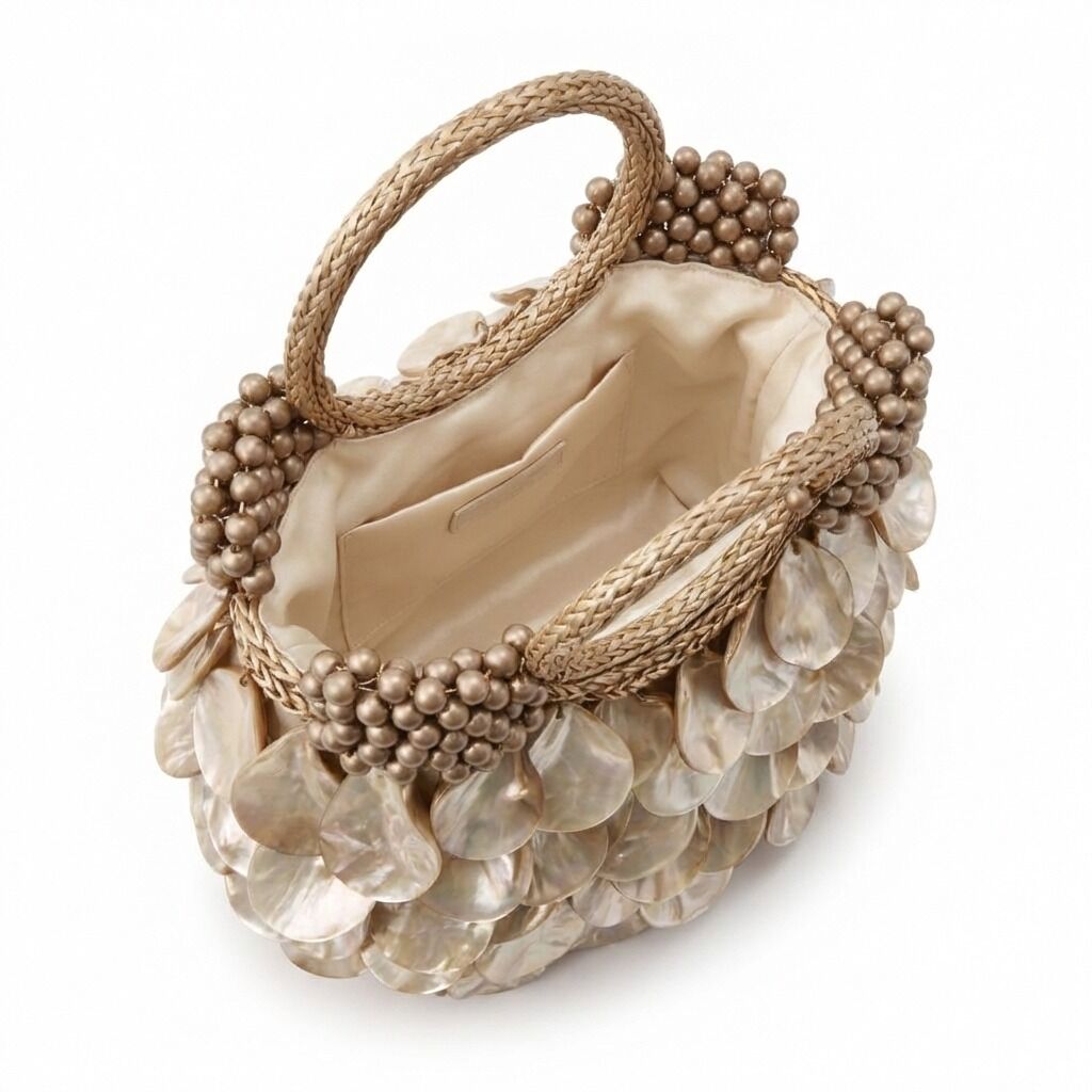 Yüzey formu, organik kesimli doğal sedef disklerin üst üste bindirilmesiyle oluşturulmuş çok katmanlı bir modül yapısına sahiptir. Bu yapı, çanta gövdesinde kontrollü bir hacim derinliği ve dinamik bir yüzey hareketi yaratırken, ışıkla temas eden her modülün bağımsız kırılım üretmesini sağlayacak biçimde konumlandırılmıştır. Katmanlar arasındaki milimetrik aralıklar, yüzeyde doğal bir akış hissi ve sofistike bir doku sürekliliği oluşturur.