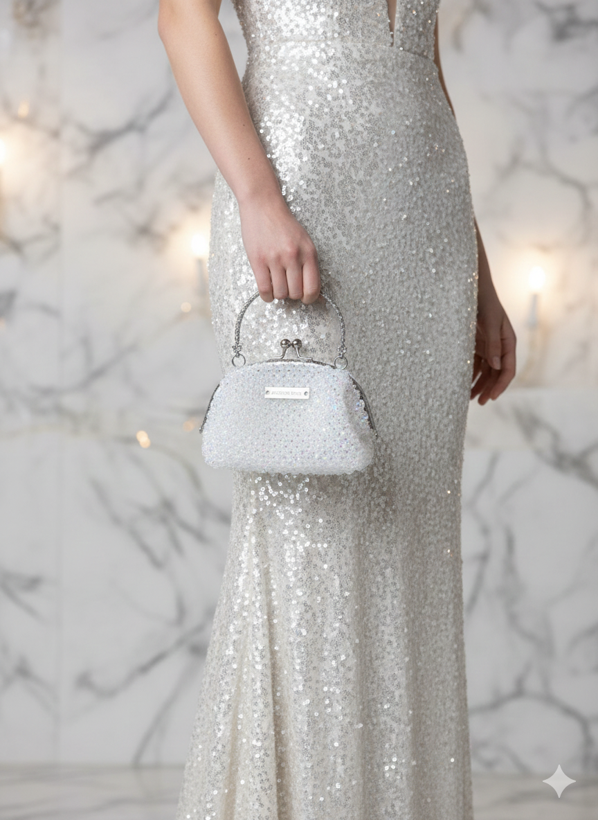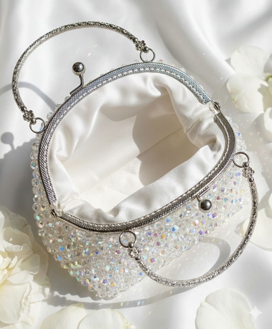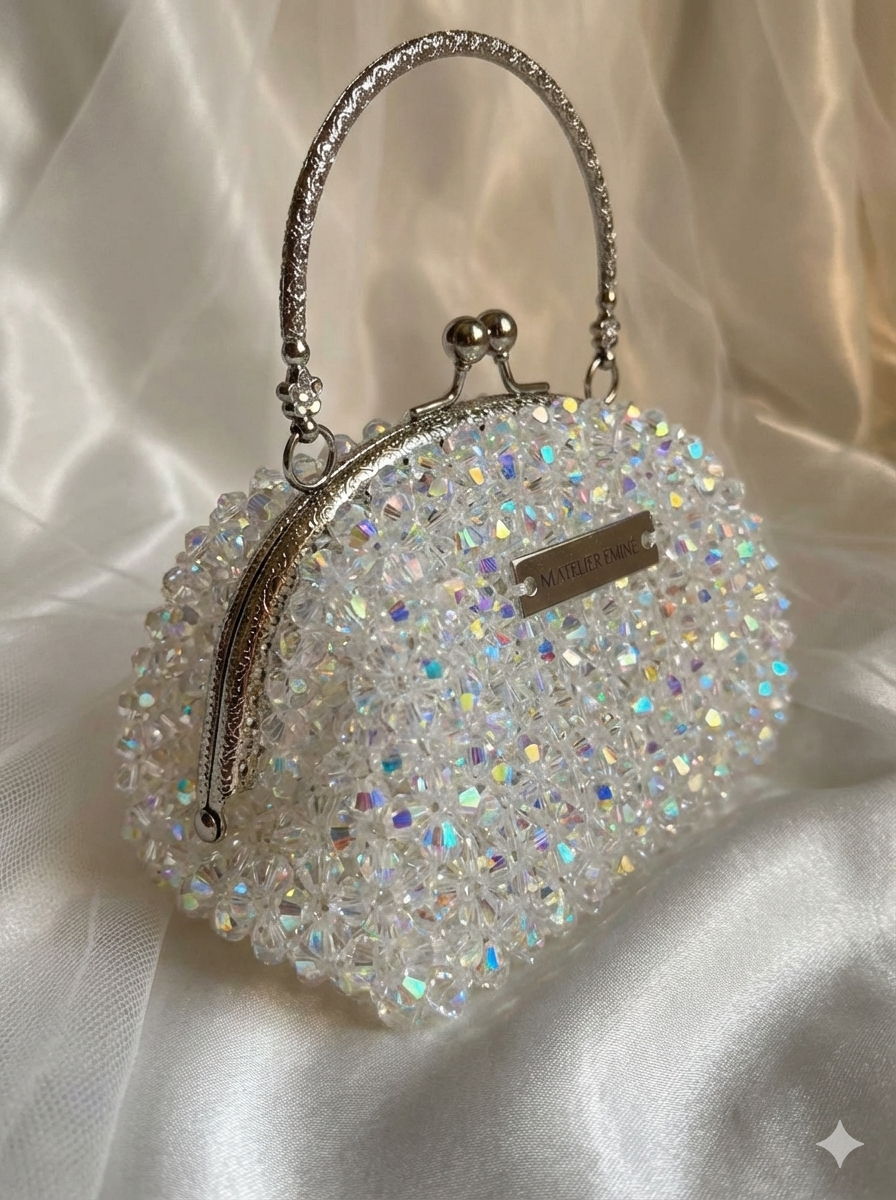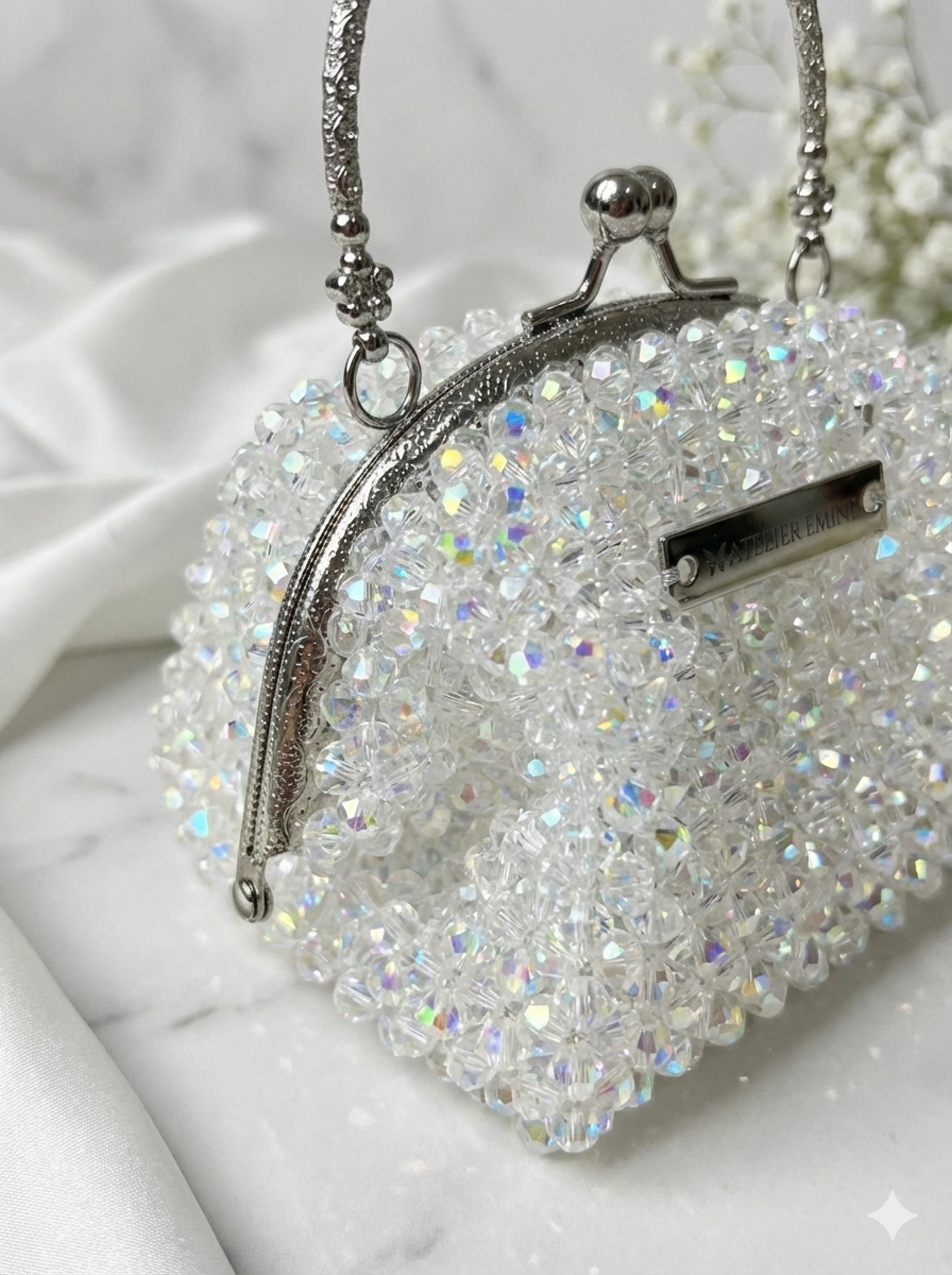 Atelier Emine’in Crystal Gelato Couture serisine ait Champagne Soufflé , 8 mm optik sınıfı kristal boncuklar, 316L paslanmaz çelik kulp ve saten astar kullanılarak tamamen el işçiliğiyle üretilmiş premium clutch modelidir.