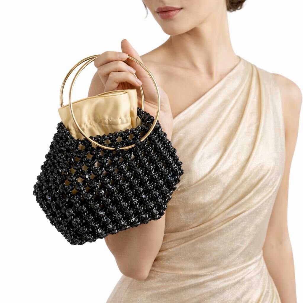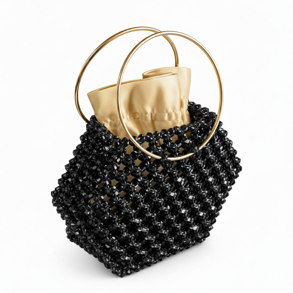 Kristal boncuklar, yüksek dayanımlı misina ile tek tek örülerek çok katmanlı bir yüzey yapısı oluşturur. Bu yapı, çantanın form bütünlüğünü korurken kristal örgünün üç boyutlu etkisini güçlendirir ve yapısal stabilite sağlar.
