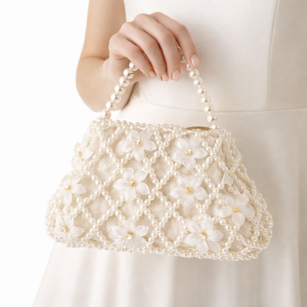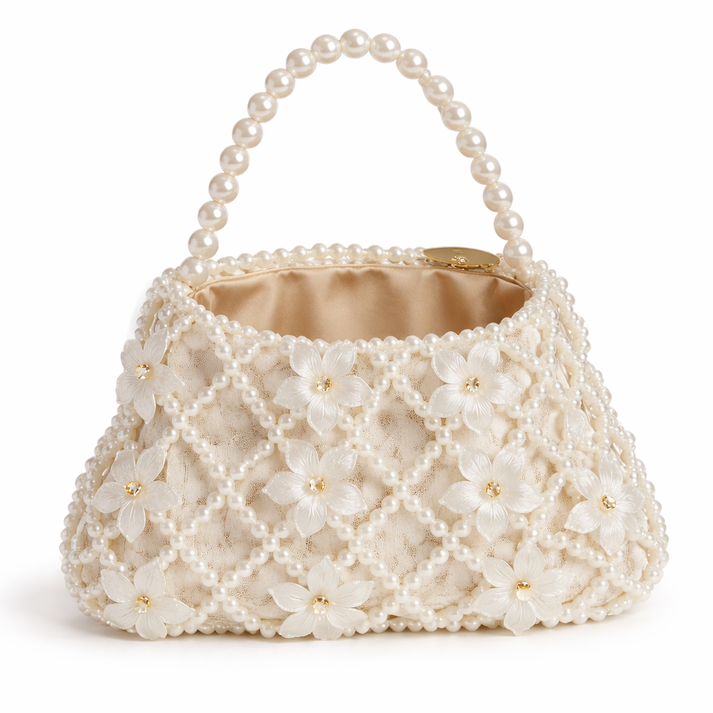 Floral Lattice, Pearl Weave Couture serisinin yapısal inci örgü yaklaşımını, dekoratif çiçek detaylarıyla daha feminen ve davet odaklı bir siluete taşıyan kompakt bir el çantası tasarımıdır. Bu modelde inci; çantanın yüzeyini kaplayan bir kaplama değil, formu ayakta tutan ve tüm hacmi organize eden ana strüktürel eleman olarak kullanılmıştır.