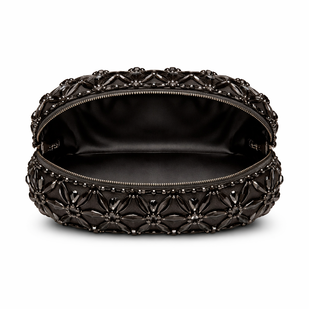 Üst bölümde konumlandırılmış fermuarlı açıklık, çantanın heykelsi formunu bozmadan kontrollü ve güvenli bir kullanım sunar. İç hacim, kristal örgüyle doğrudan teması engelleyecek şekilde yerleştirilmiş %100 saten astar ile kaplanmış; pürüzsüz, düzenli ve korunaklı bir iç yapı elde edilmiştir.