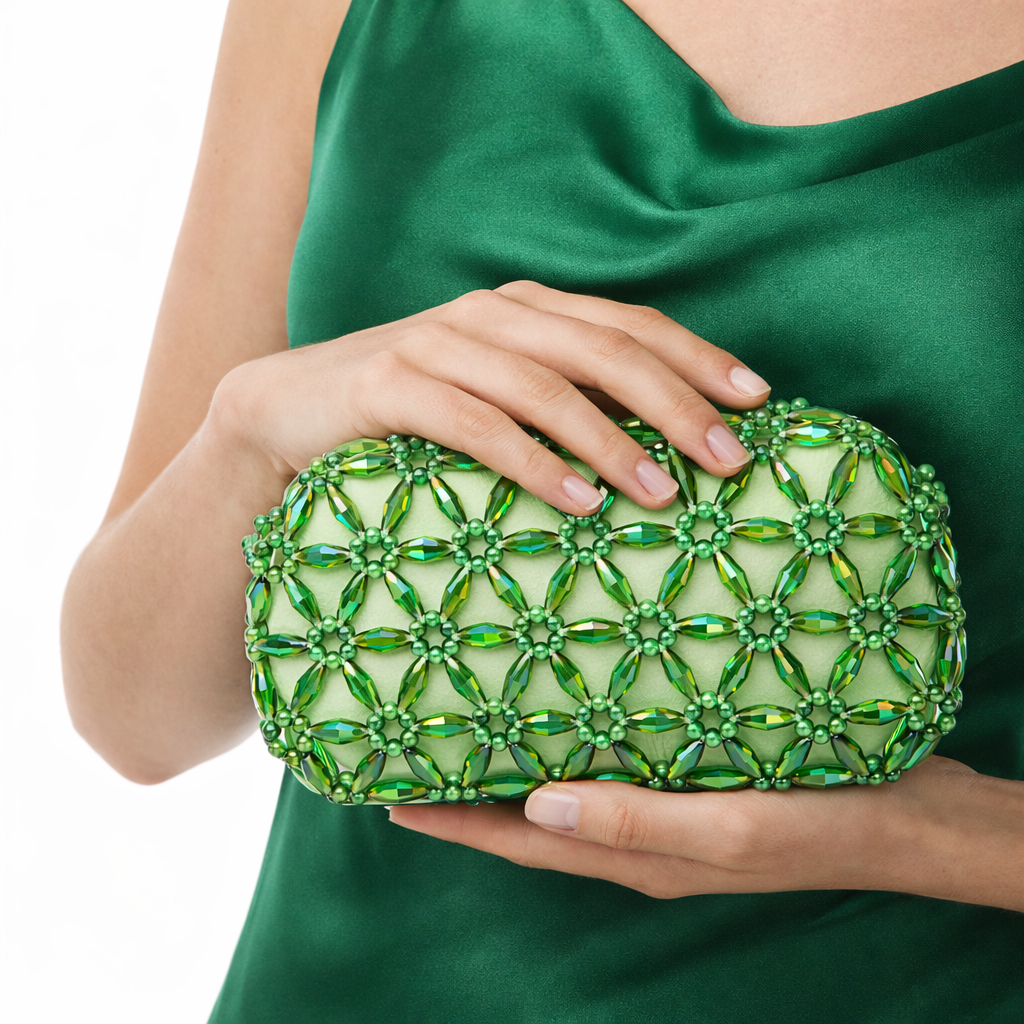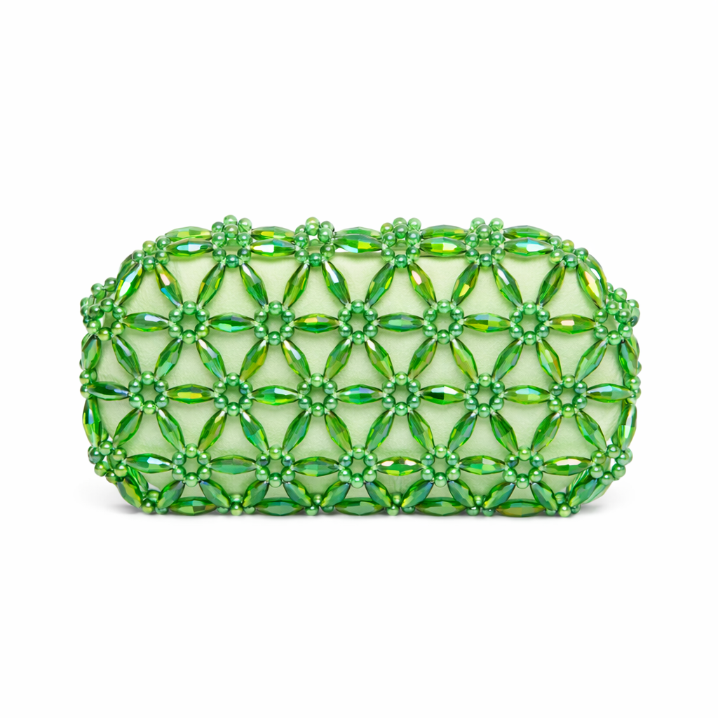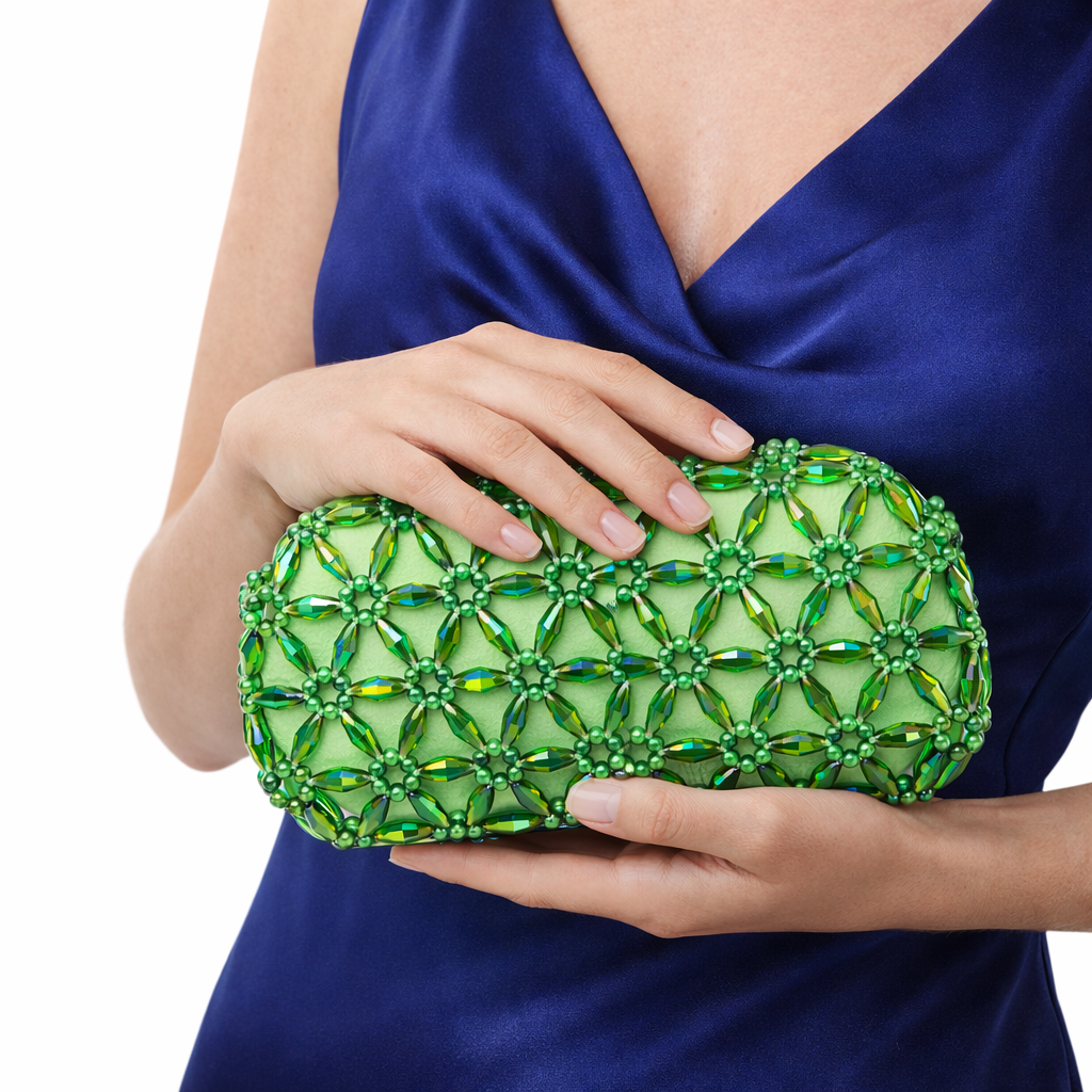 Atelier Emine’in Crystal Gelato Couture serisine ait Fresco Wasabi, optik sınıfı kristal boncukların modüler kafes örgü tekniğiyle bir araya getirilmesiyle tamamen el işçiliğiyle üretilmiş, oval hacimli heykelsi bir clutch modelidir.