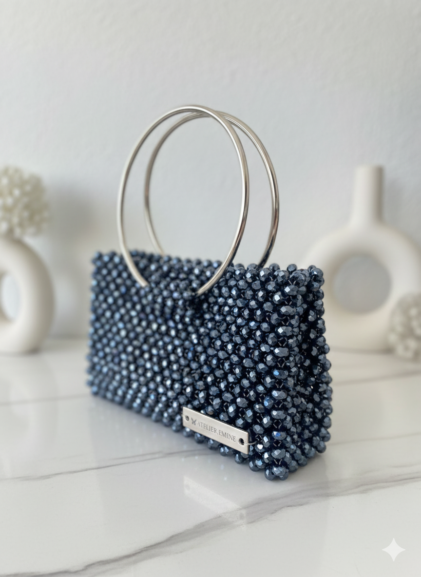 Atelier Emine’in Crystal Gelato Couture serisine ait Graphite Cream , 8 mm optik sınıfı kristal boncuklar, 316L paslanmaz çelik kulp ve saten astar kullanılarak tamamen el işçiliğiyle üretilmiş premium clutch modelidir.