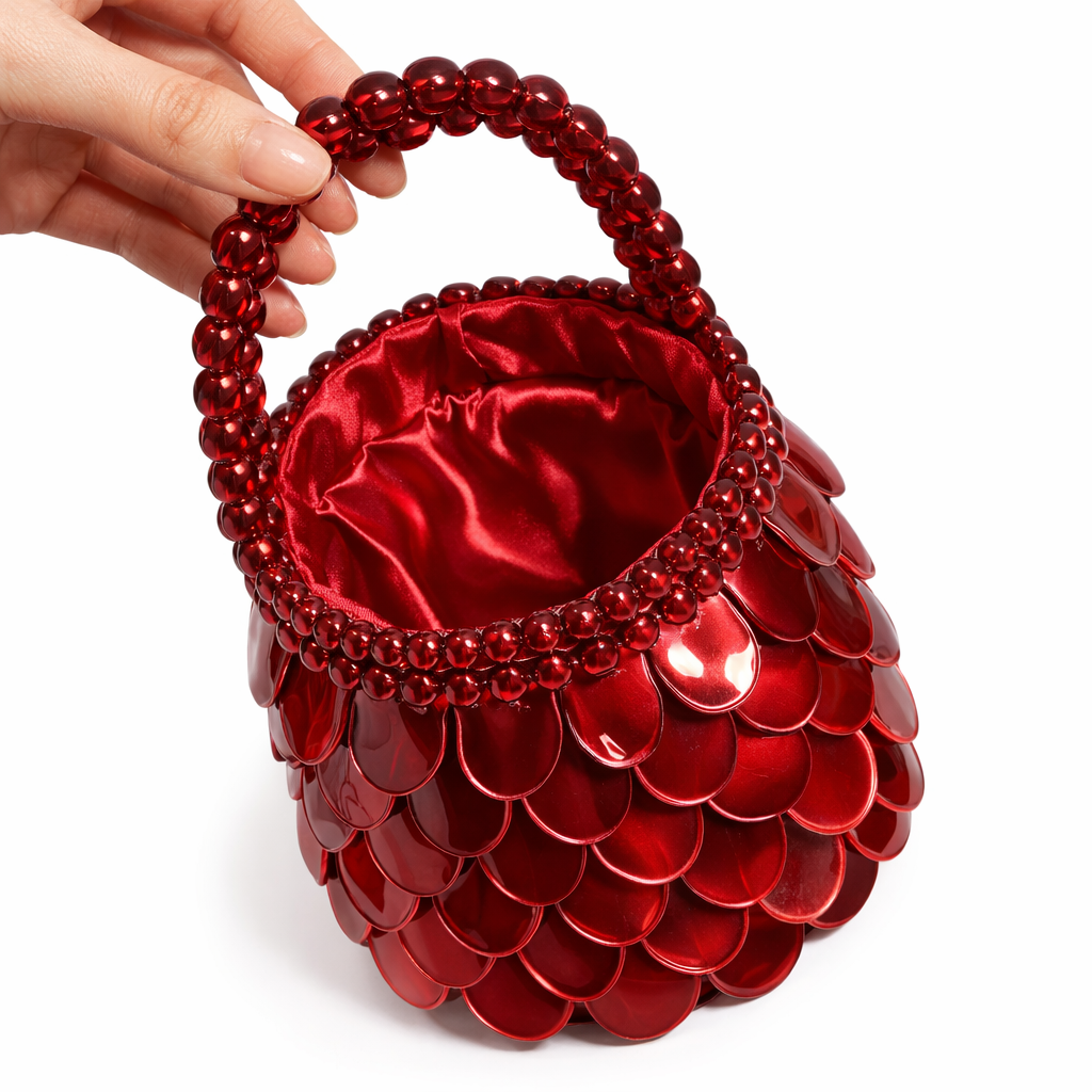 Çantanın dış yüzeyi, damla formunda hassas kesilmiş doğal sedef modüllerin, kontrollü bindirme (overlapping) tekniğiyle üç boyutlu bir kabuk mimarisi oluşturacak şekilde kurgulanmasıyla meydana gelir. Bu ölçekli katmanlama sistemi, yüzeyde ritmik bir akış sağlarken; ışığın farklı açılardan kırılmasını optimize eden yarı-organik bir doku üretir. Her bir sedef plaka, doğal malzemenin lif yönüne paralel biçimde işlenmiş olup, yüzey boyunca homojen bir parlaklık dağılımı elde edilmiştir.