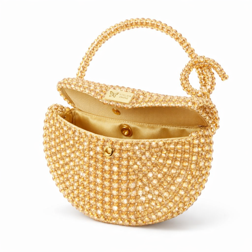 Atelier Emine’in Crystal Gelato Couture serisine ait Melo Caramello, 8 mm optik sınıfı kristal boncukların yüksek dayanımlı misina ile örülmesiyle tamamen el işçiliğiyle üretilmiş, yarım ay formunda premium mini çanta modelidir.