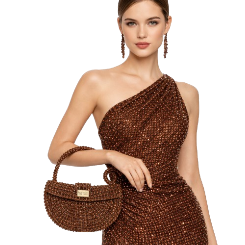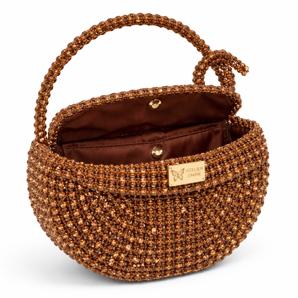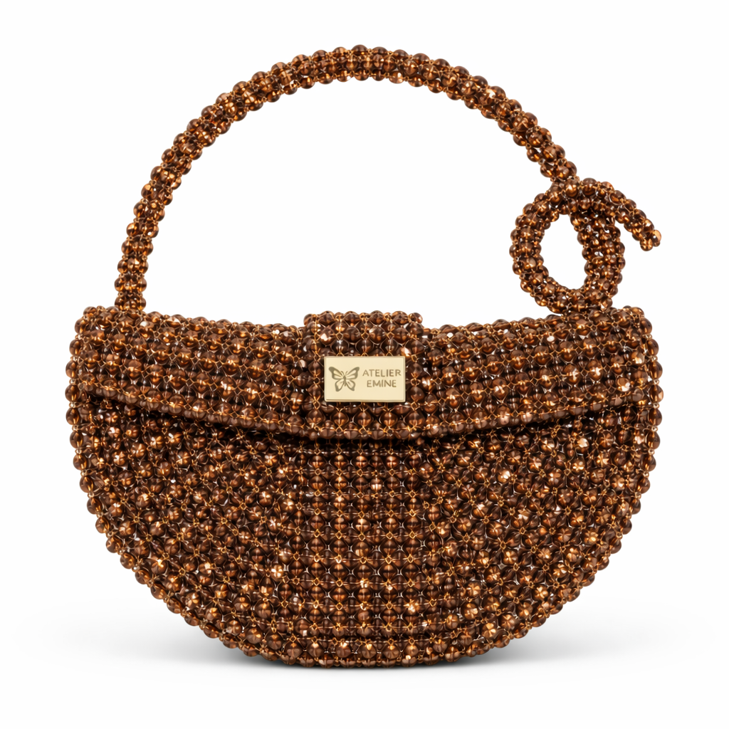Atelier Emine’in Crystal Gelato Couture serisine ait Melo Nocciola, 8 mm optik sınıfı kristal boncukların yüksek dayanımlı misina ile örülmesiyle tamamen el işçiliğiyle üretilmiş, yarım ay formunda premium mini çanta modelidir.